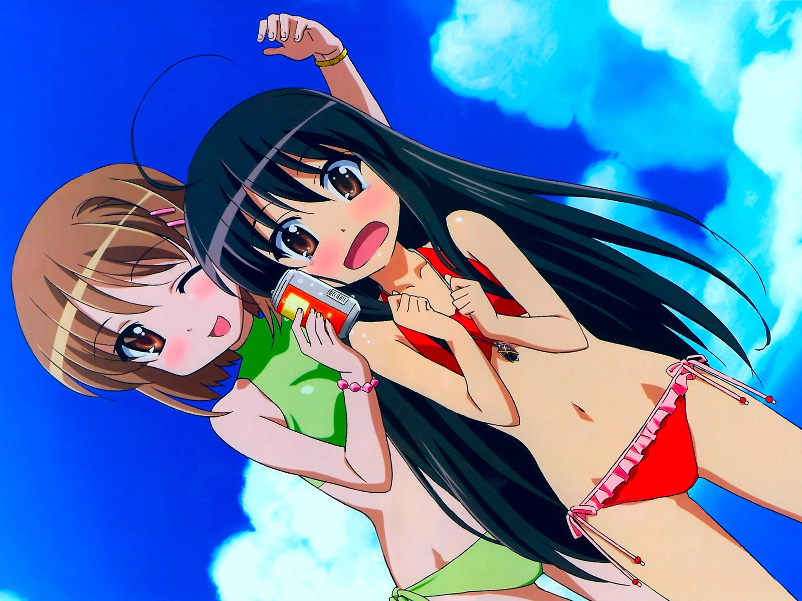 Description: Two women in bikinis are standing together in the sky with a cell phone in their hand and a sky background.