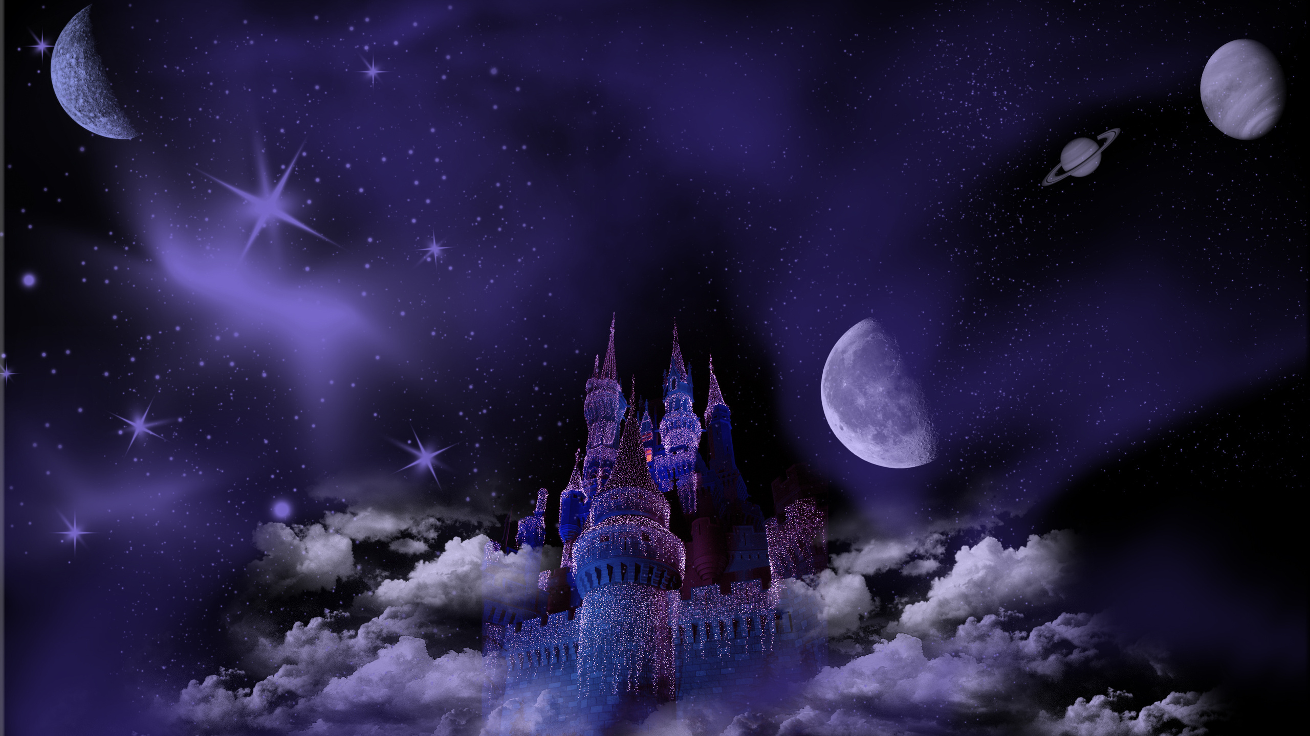 Description: A castle in the sky with a lot of stars and moon in the sky above it and a few clouds.