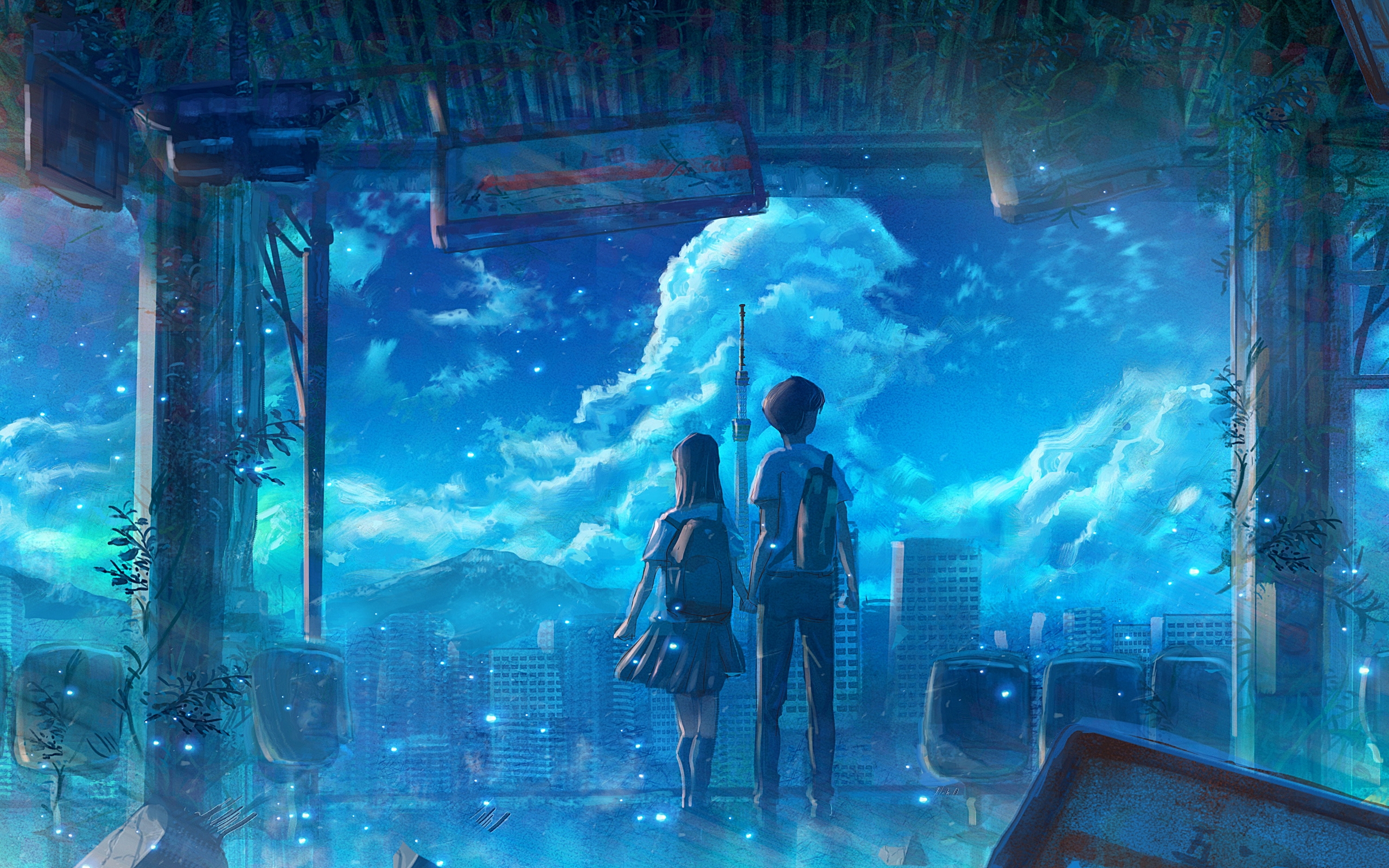 Description: A couple of people standing in a room with a sky background and clouds above them and a city below.