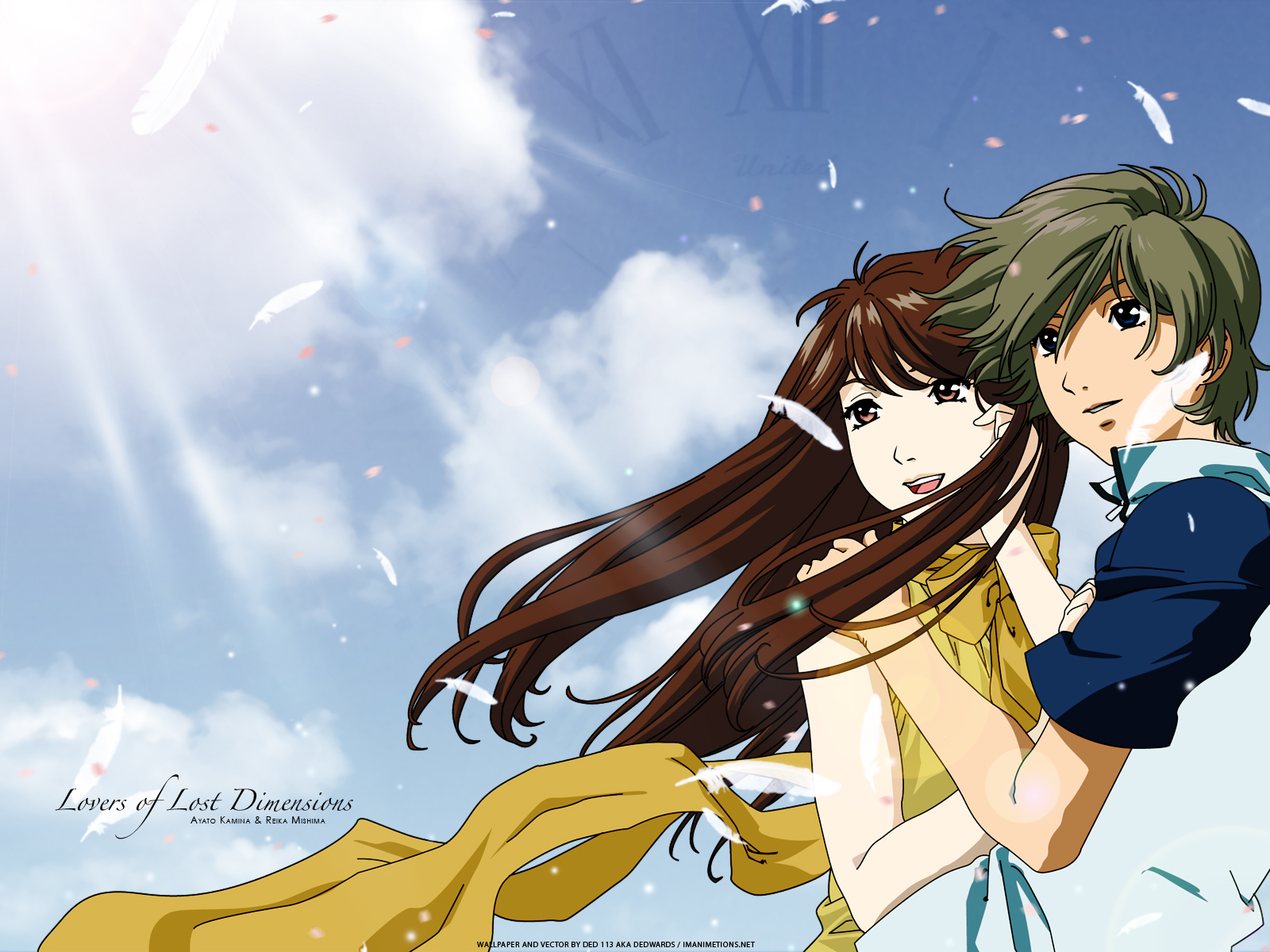 Description: A couple of anime characters hugging each other in the sky with a clock in the background and a blue sky with white clouds.