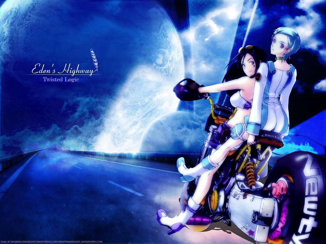 Description: A couple of people riding on the back of a motorcycle in the sky with a moon behind them and a blue sky.
