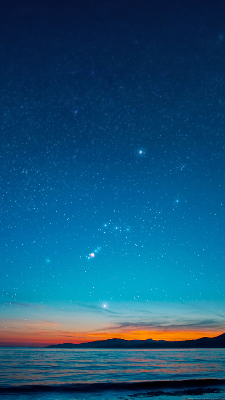 Description: A view of the sky with stars and a bright orange glow on the horizon and the ocean below it.