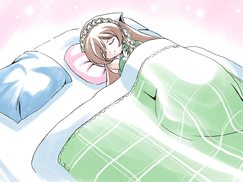 Description: A drawing of a person sleeping in a bed with a blanket on it's side and a pillow on the other side.