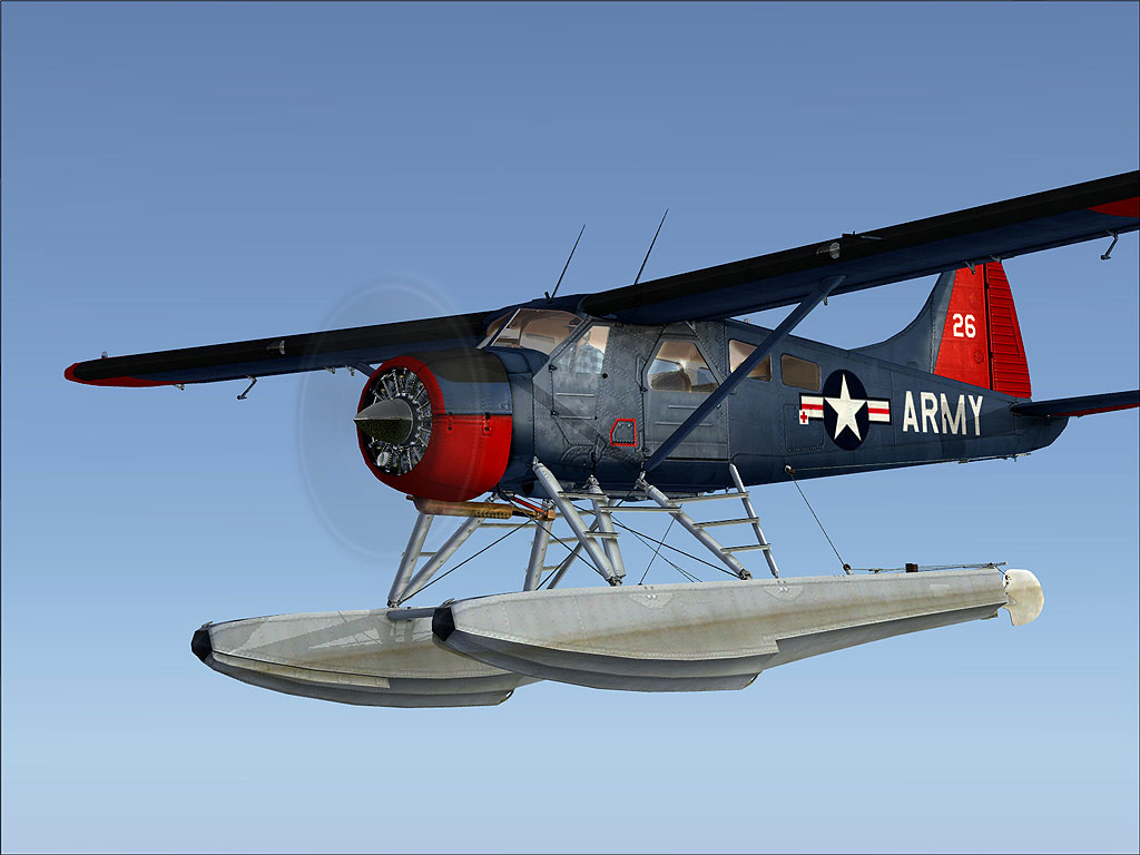 Description: A small airplane flying through a blue sky with a propeller on it's side and a landing gear attached to the wing.