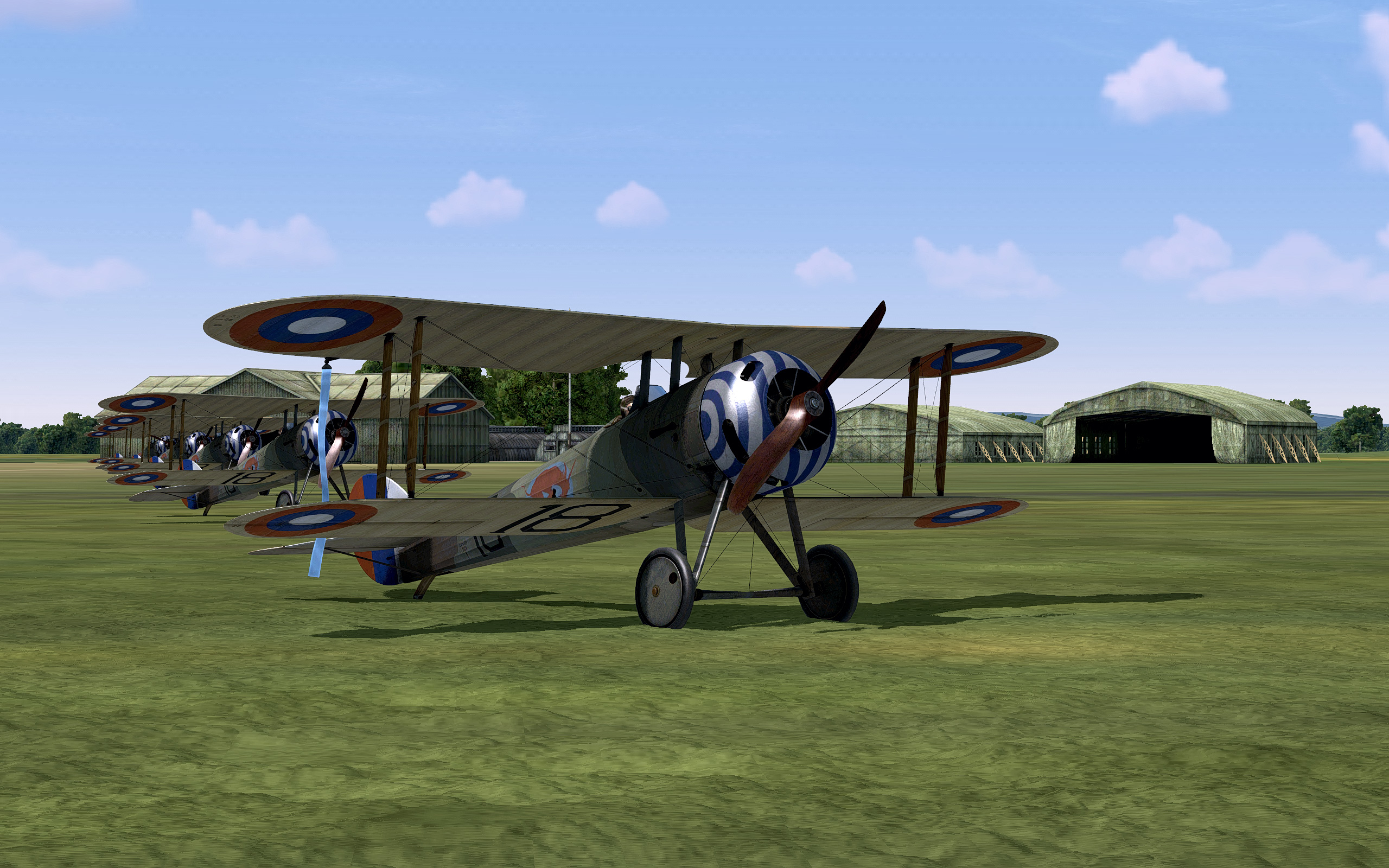 Description: A small airplane sitting on top of a grass covered field next to a hangar with a sky background and a few people standing around.