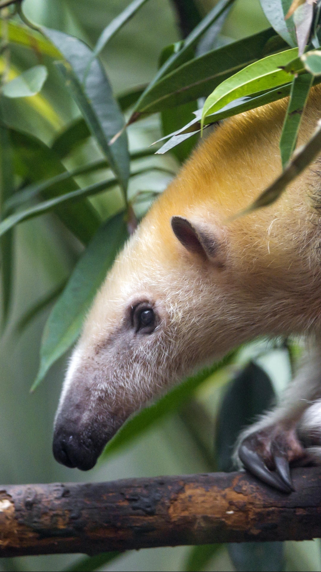Description: A small animal is sitting on a branch in a tree with leaves around it and looking at the camera.