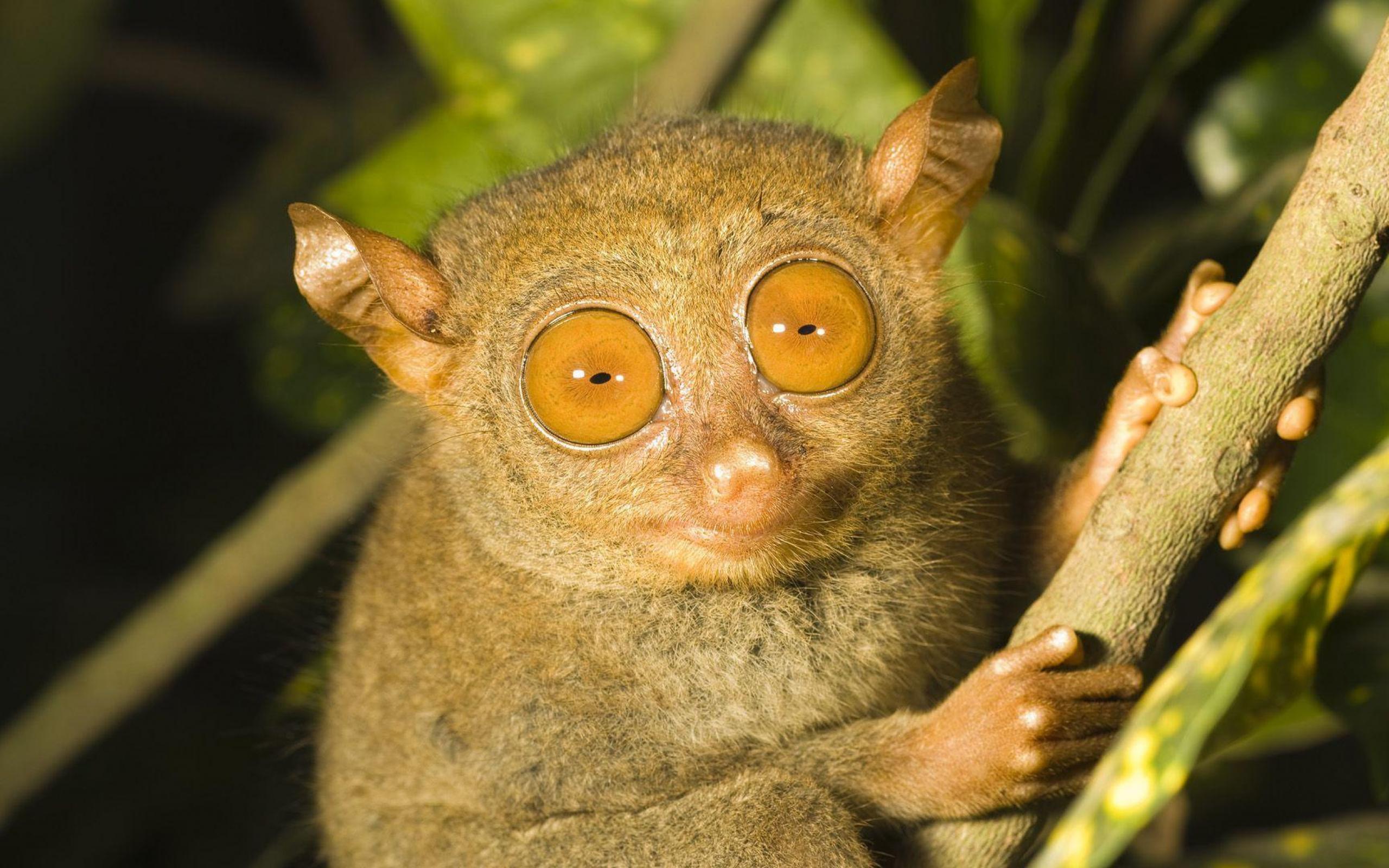 Description: A small animal with large yellow eyes sitting on a tree branch with leaves around it's edges and eyes open.