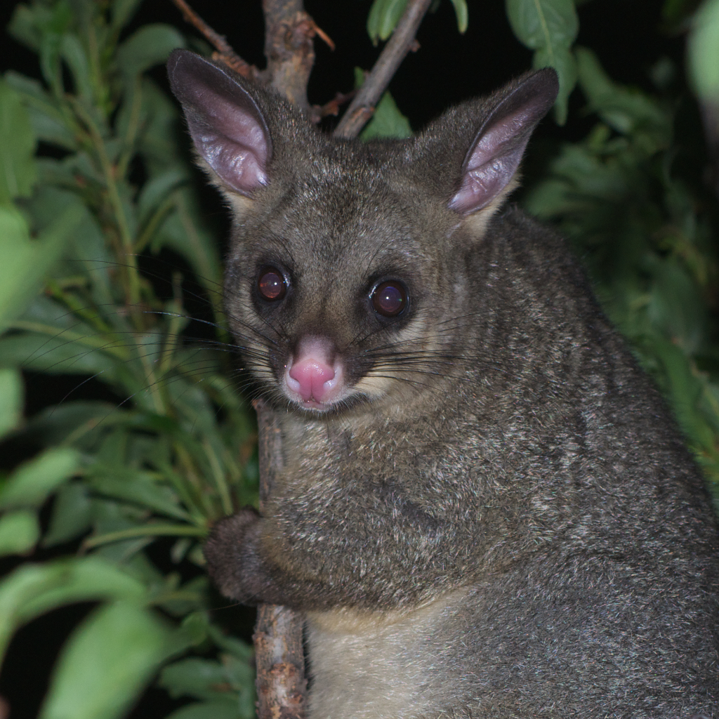 Description: A small animal with a pink nose and a bushy background is looking at the camera with a sad look on its face.