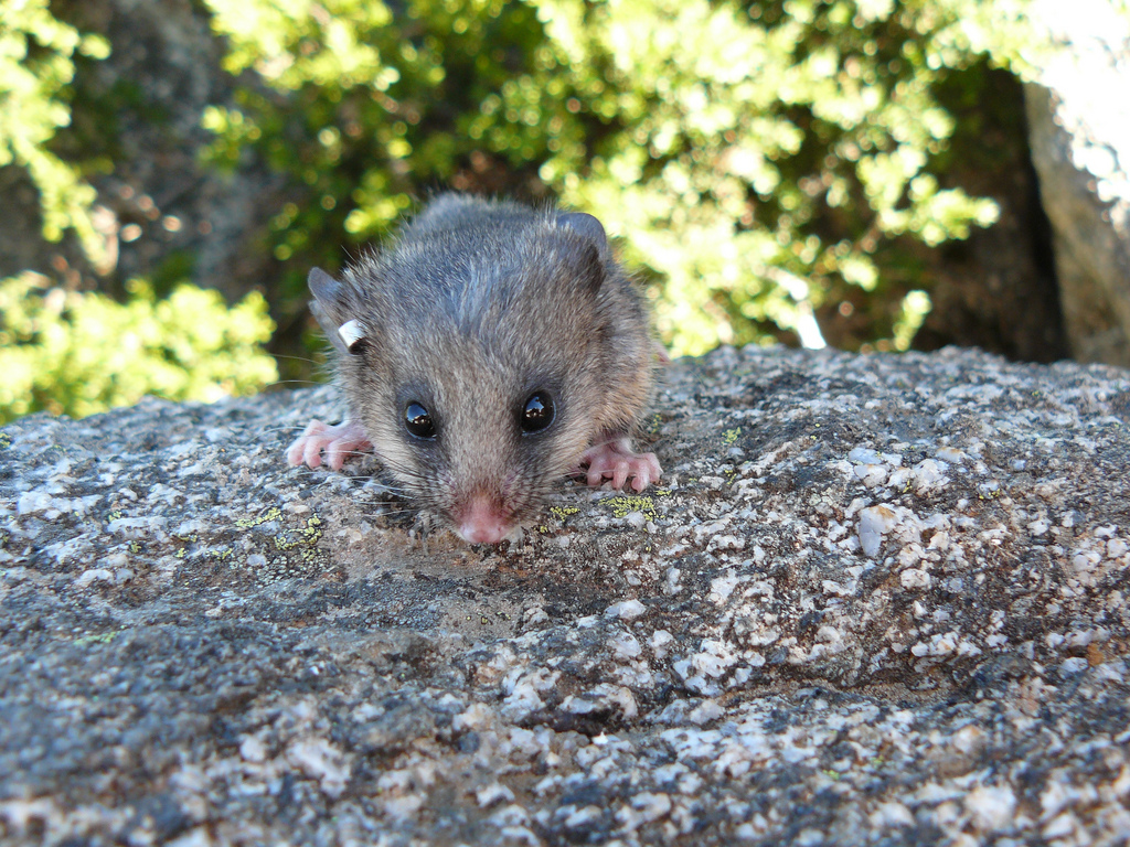 Description: A small animal standing on top of a rock next to trees and bushes in the background.