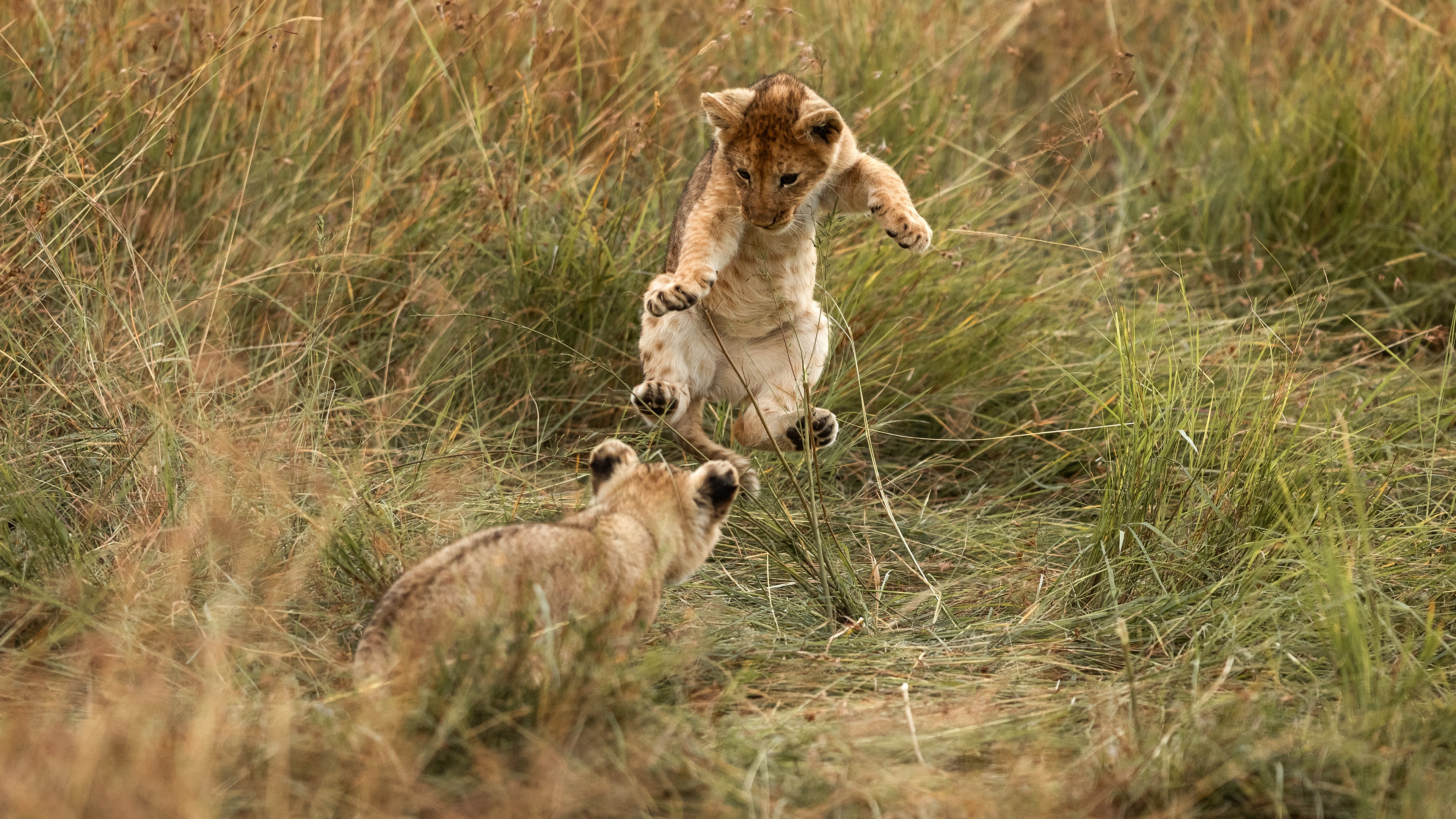 Description: Two small animals playing in a grassy field together.