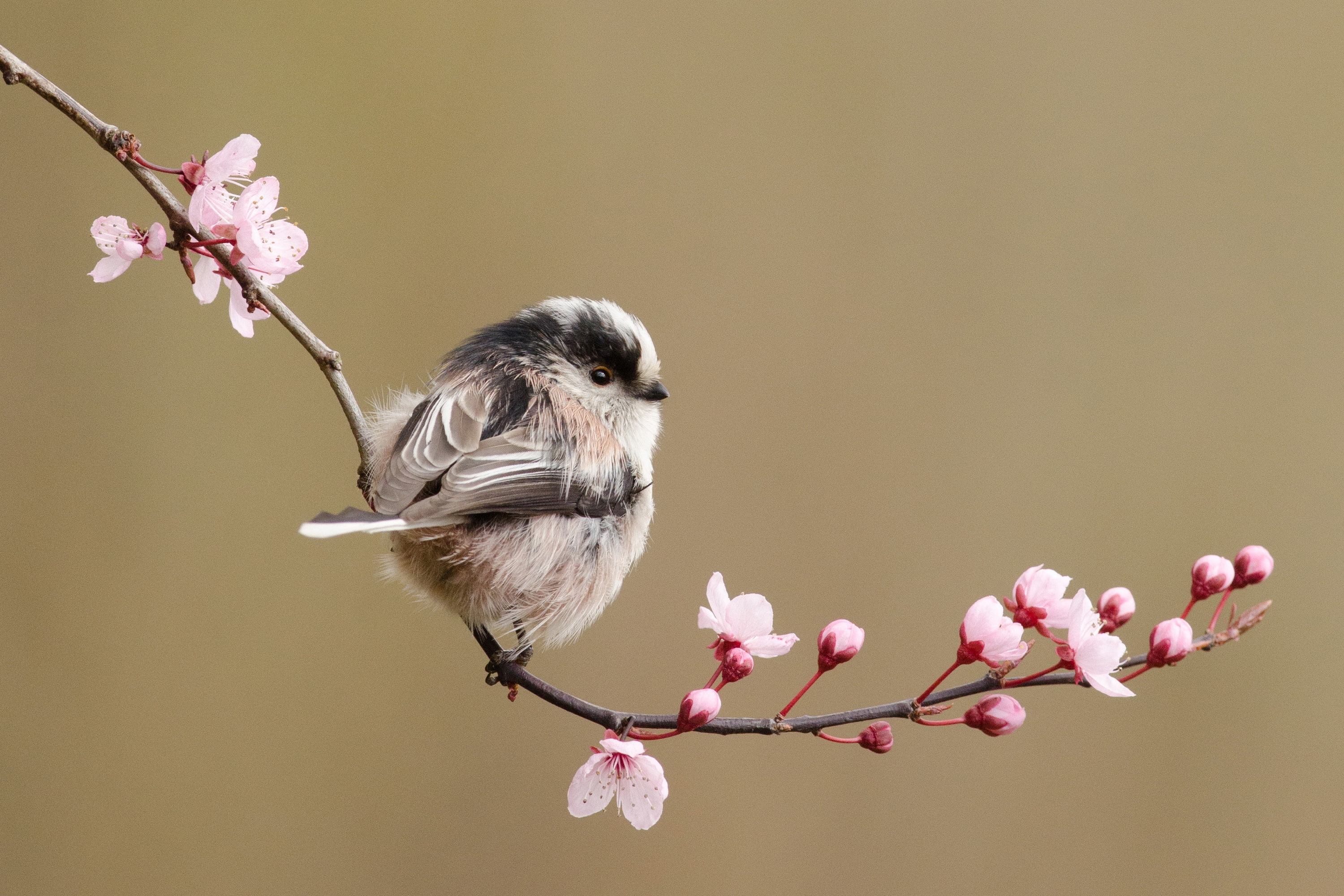 Description: A small bird sitting on a branch with pink flowers on it's branch and a brown background behind it.