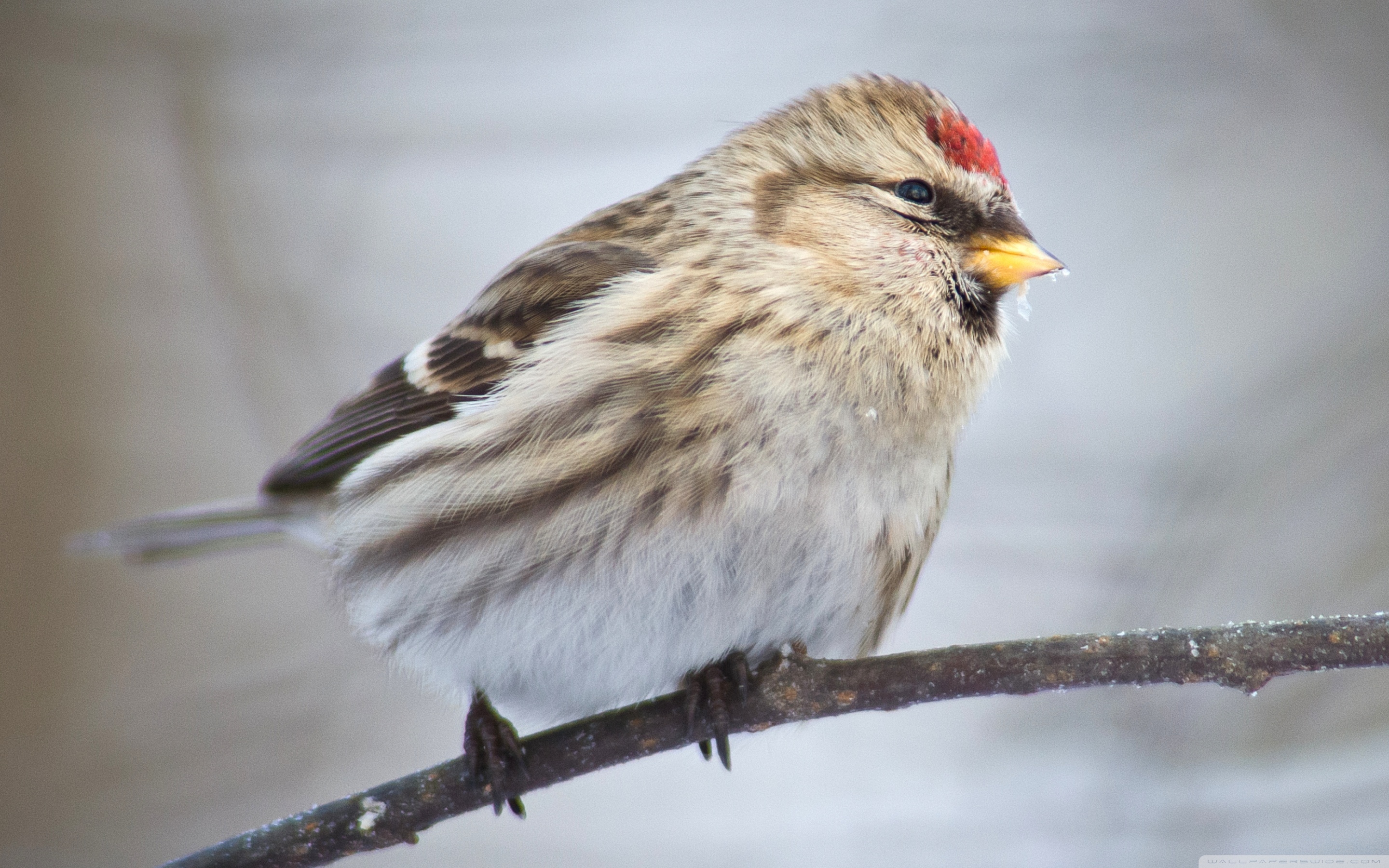 Description: A small bird sitting on a branch with a blurry background of snow and branches in the foreground.