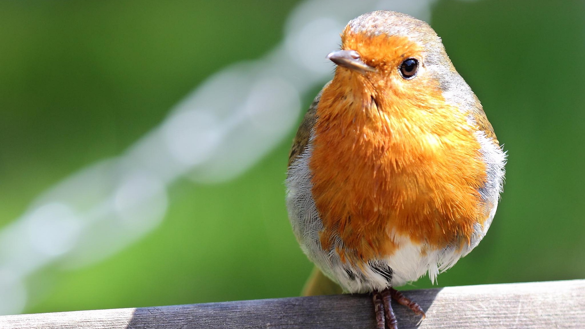 Description: A small bird sitting on a wooden fence post with a blurry background of trees and grass in the background.