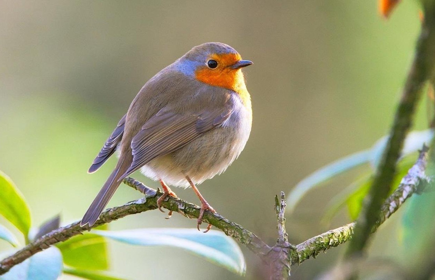 Description: A small bird perched on a branch in a tree with leaves and a blurry background of leaves and branches.