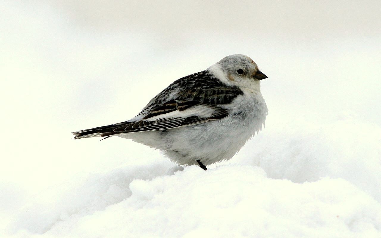Description: A small bird standing on a pile of snow in the snow with a white background and a black and white stripe on the wing.