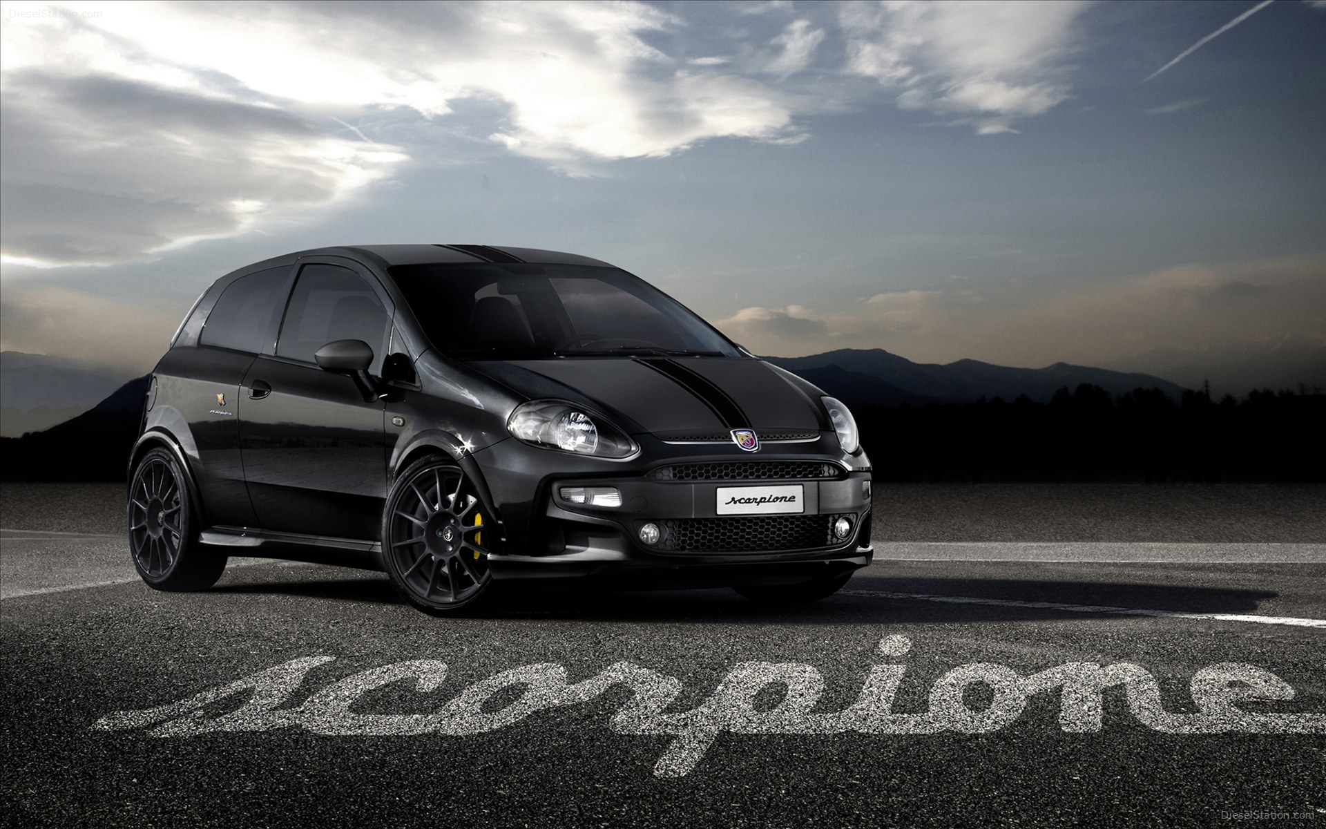 Description: A small black car parked on a road with a sky background and clouds in the background with the word scorpion written on the road.