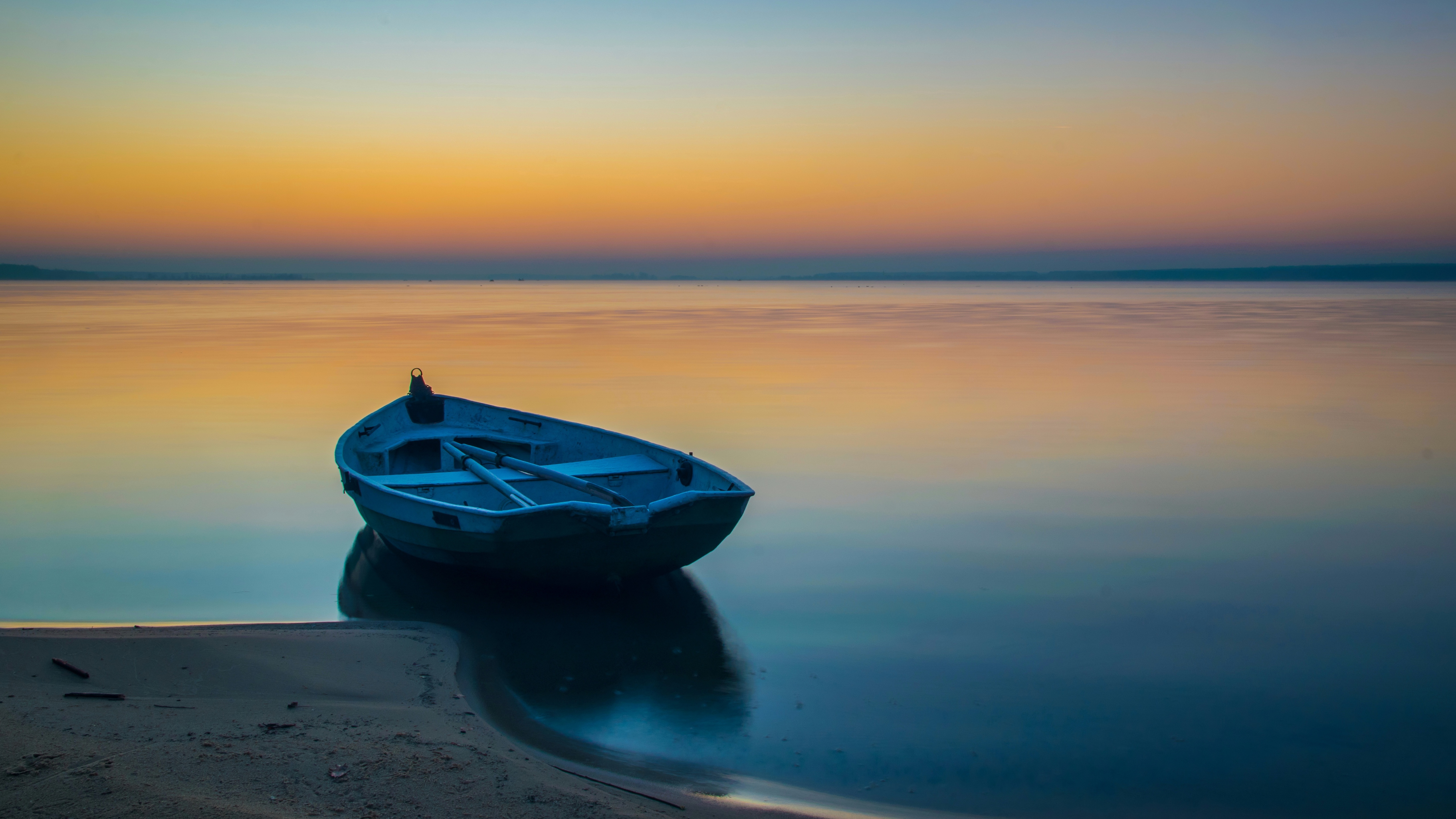 Description: A small boat sitting on top of a lake at sunset or dawn with a reflection of the sky in the water.
