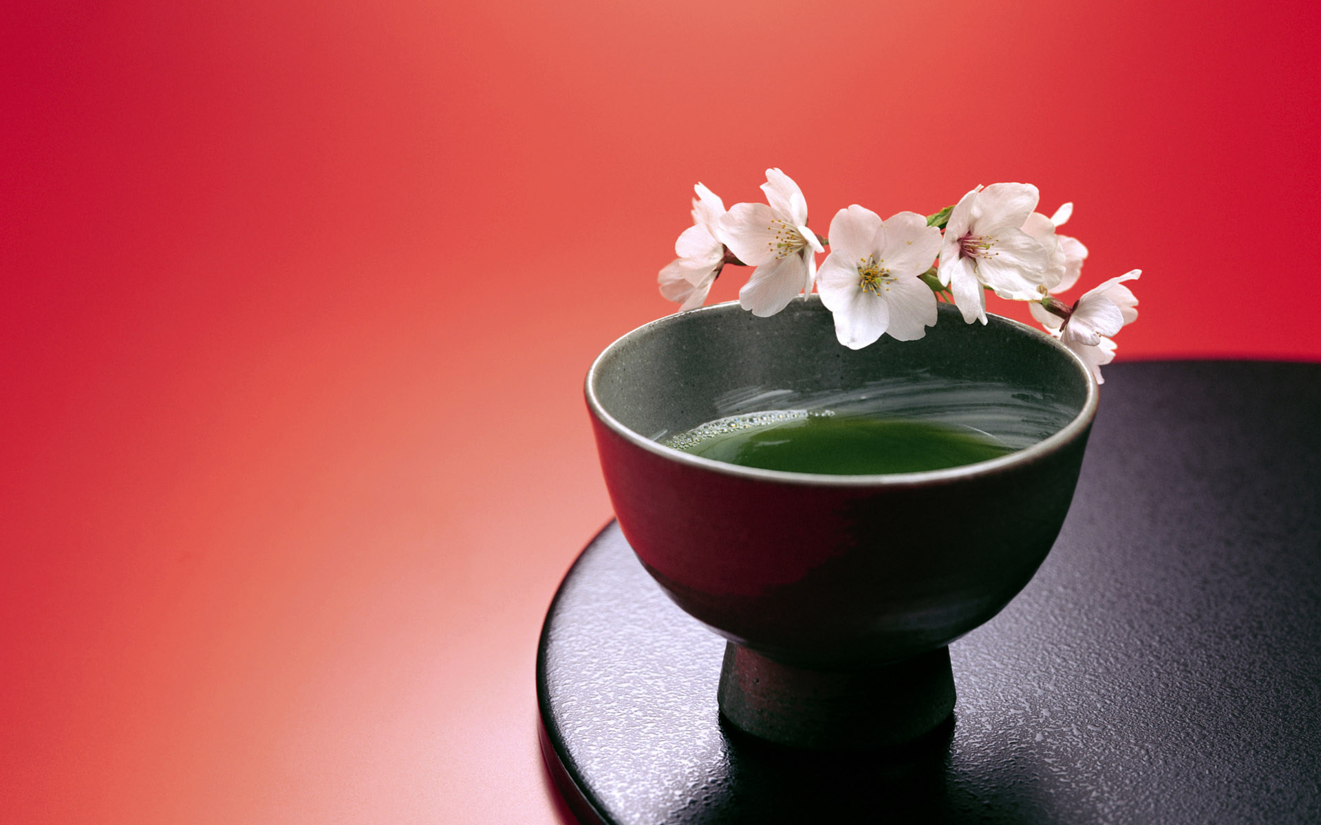 Description: A small bowl with a green liquid in it and a flower in it on a table with a red background.
