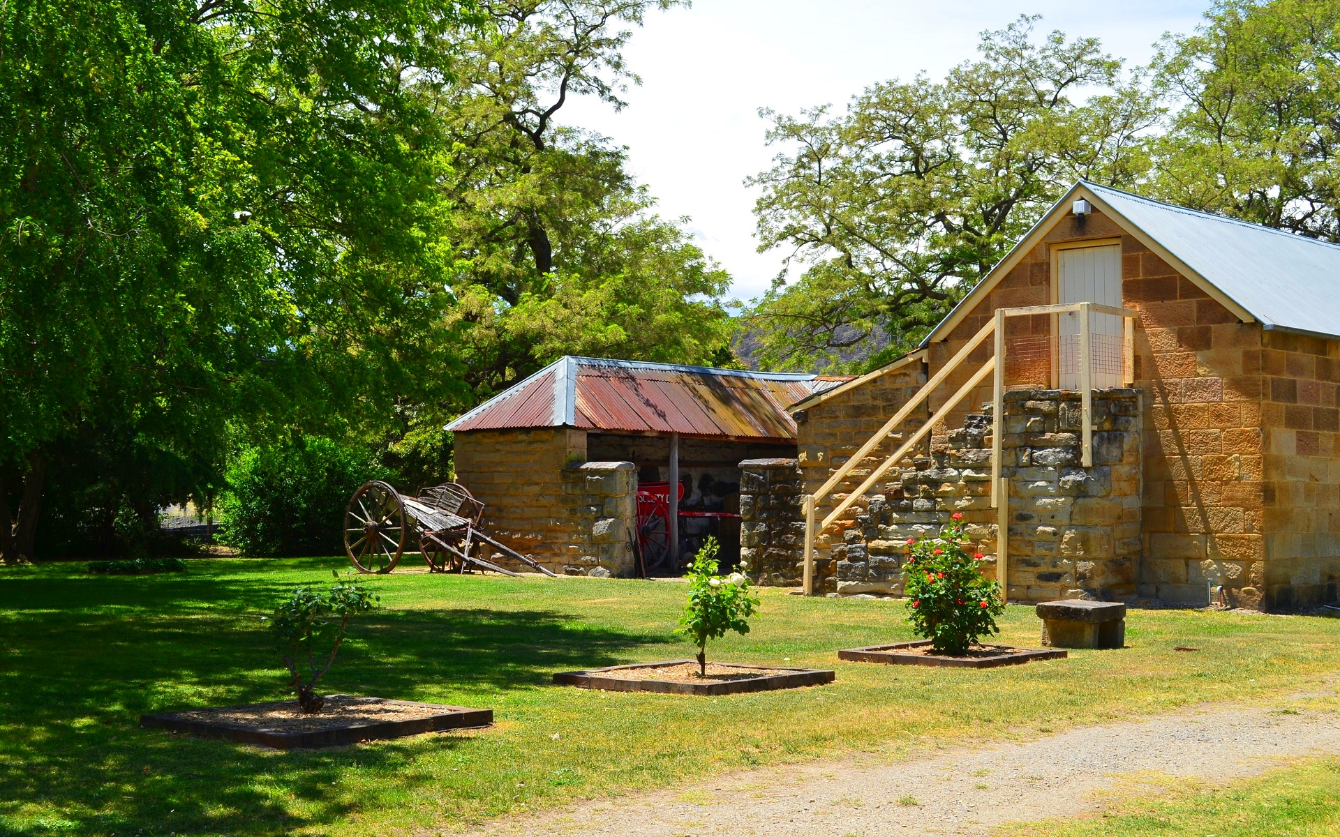 Description: A small building with a metal roof and a tree in the yard next to it and a dirt path.