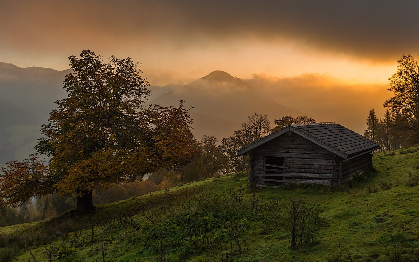 Description: A small cabin on a grassy hill with a mountain in the background at sunset with clouds in the sky.