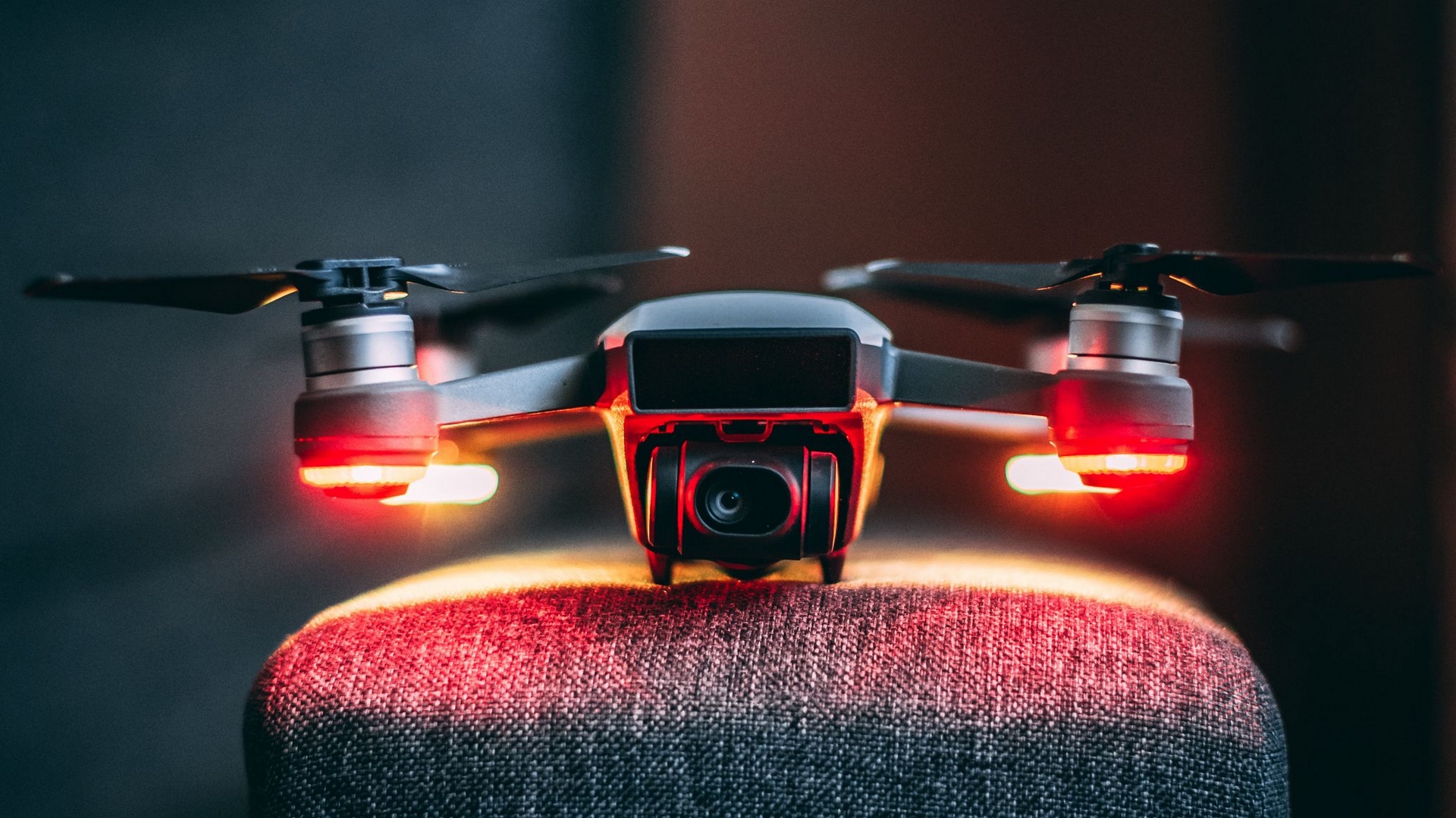 Description: A small camera mounted on top of a chair with two lights on it's sides and a remote control on the back of the chair.