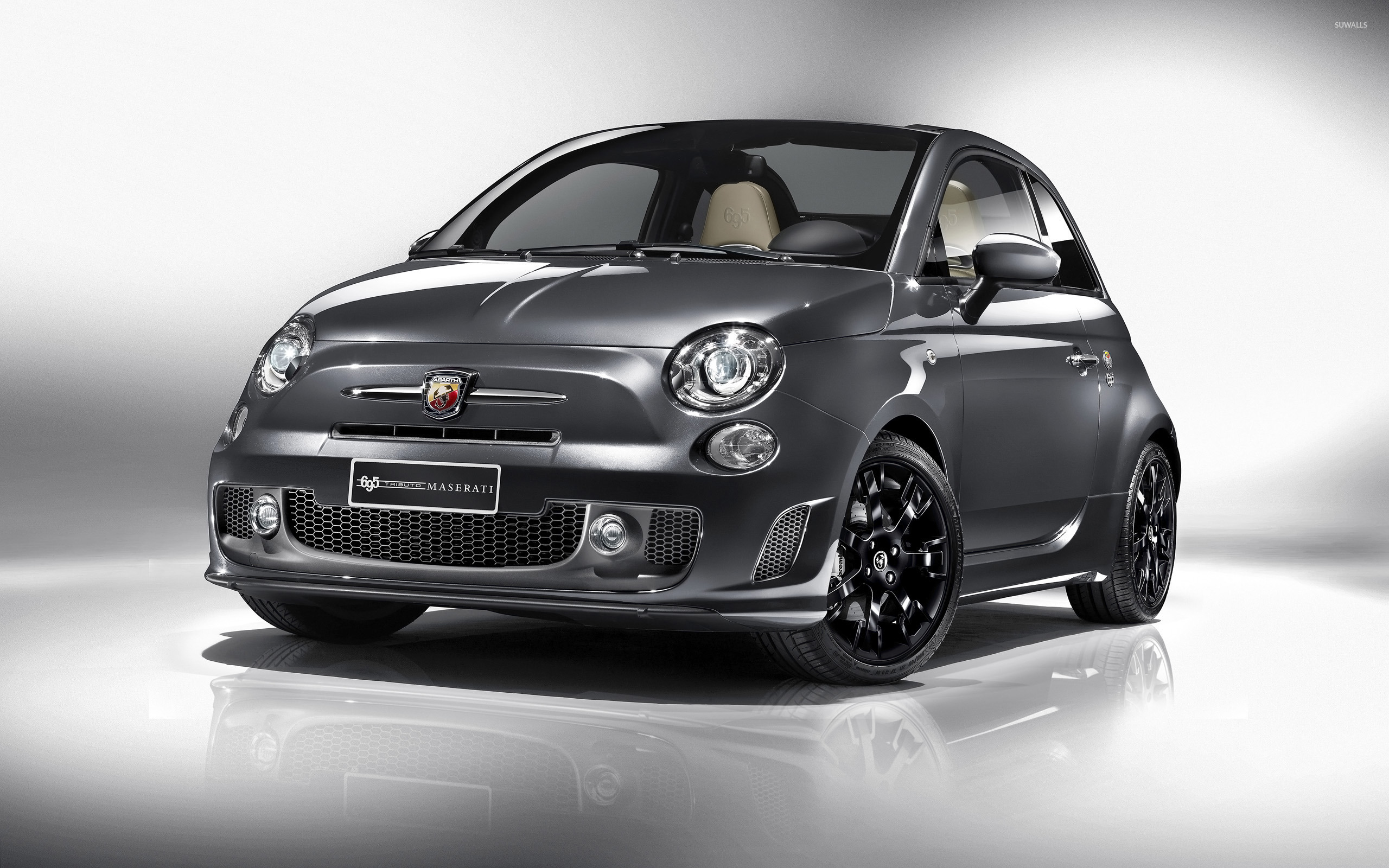 Description: A small car is shown in a studio setting with a white background and a black and white background with a light.