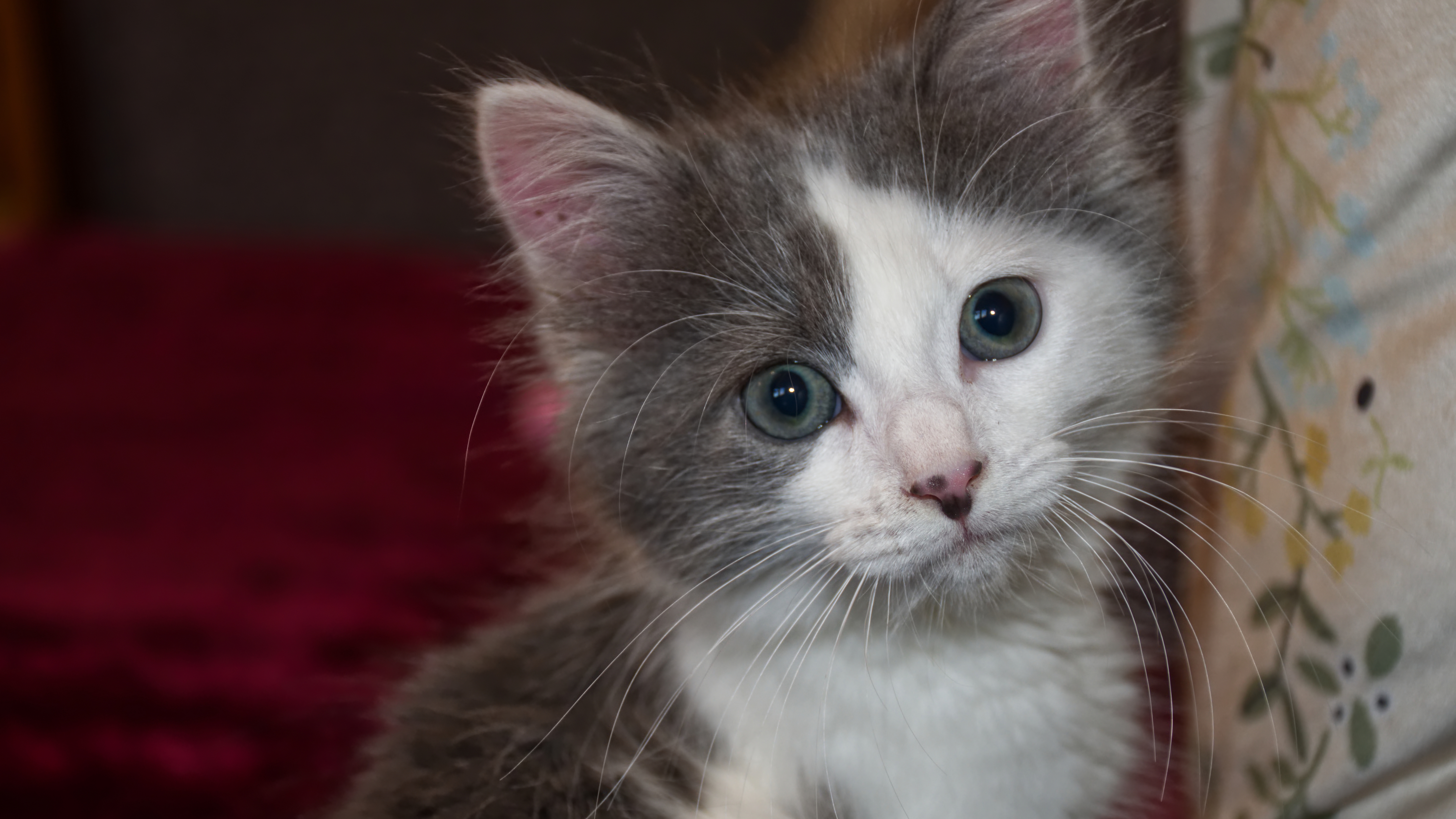 Description: A small kitten with blue eyes sitting on a couch cushion looking at the camera with a serious look on its face.