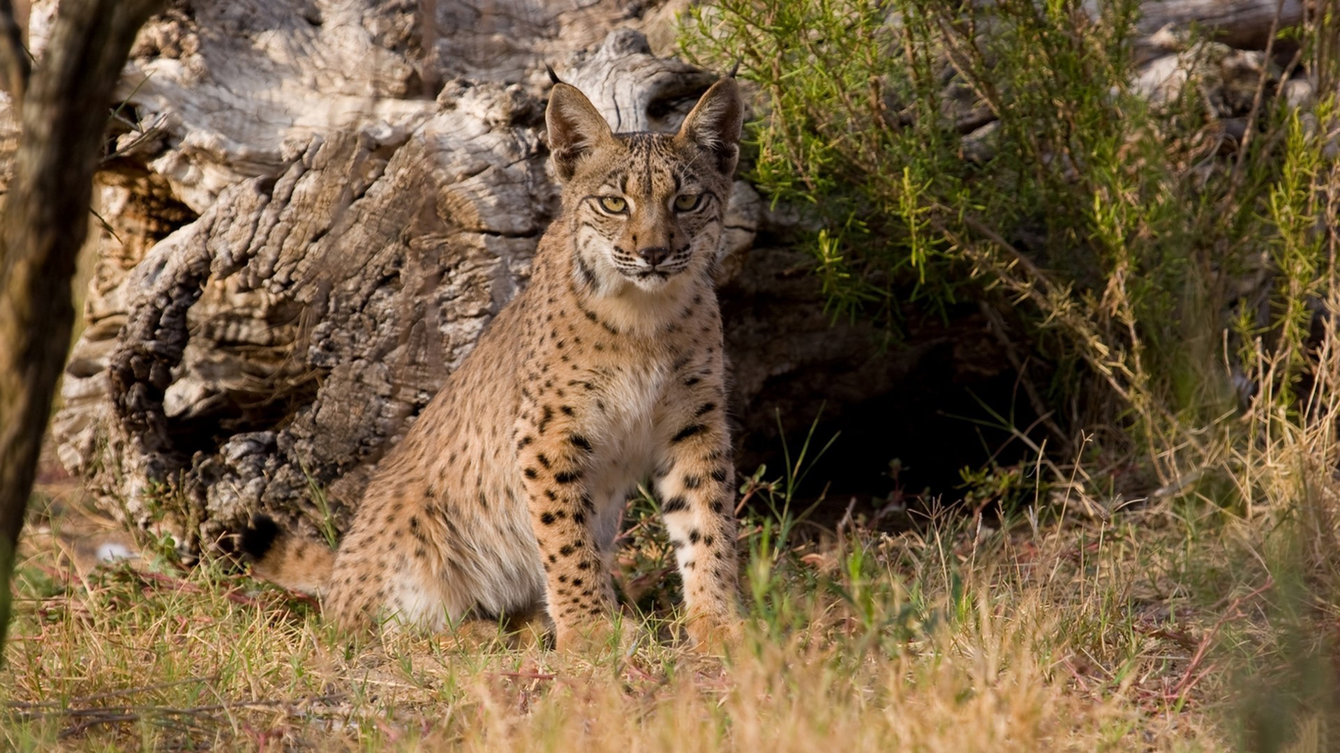 Description: A small cat sitting in the grass near a tree trunk and a rock wall in the background with a small bush.