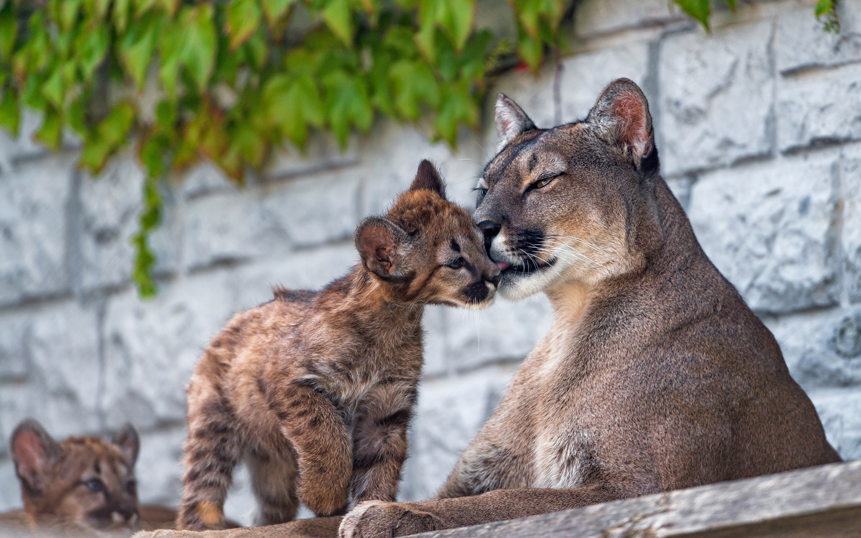 Description: A couple of small cats sitting next to each other on a stone wall next to a tree and a brick wall.
