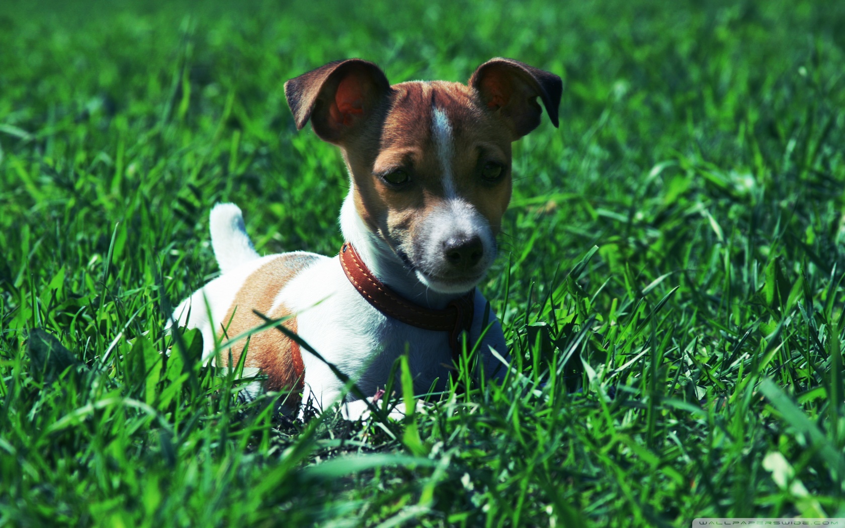 Description: A small dog laying in the grass looking at the camera with a sad look on his face and eyes.