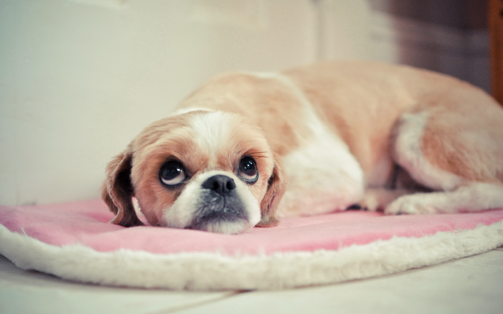 Description: A small dog laying on a pink blanket on the floor with a sad look on its face and eyes.