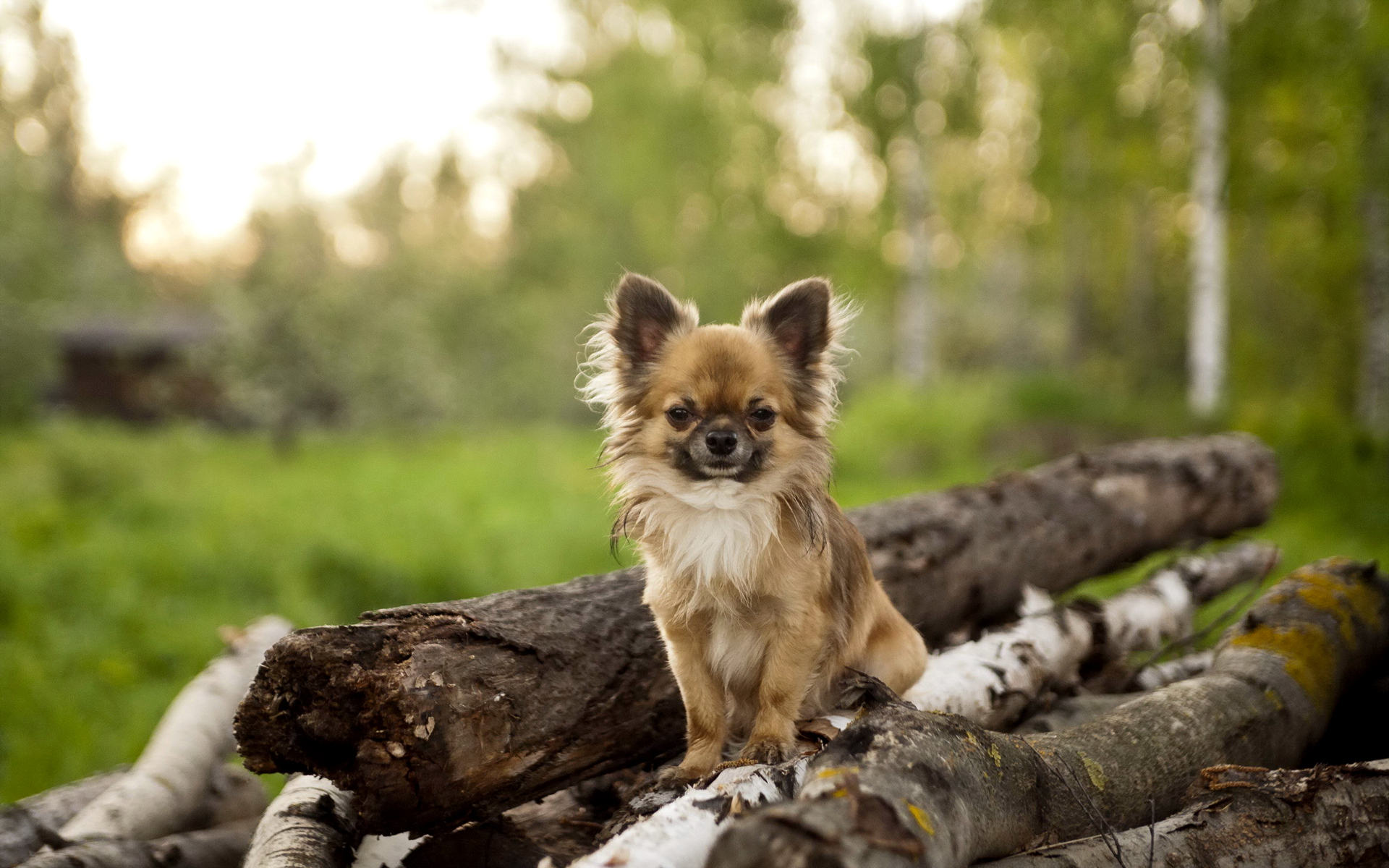 Description: A small dog sitting on top of a pile of logs in a forest next to a forest filled with trees.