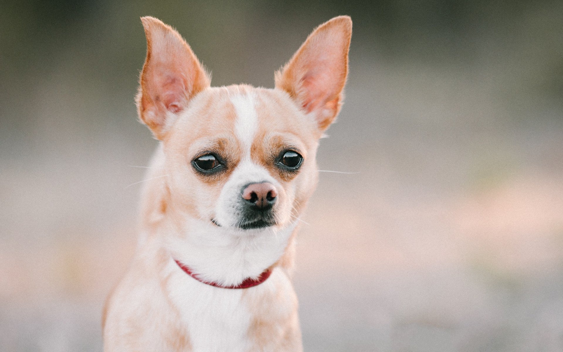 Description: A small dog with a red collar looking at the camera with a blurry background of grass and bushes.
