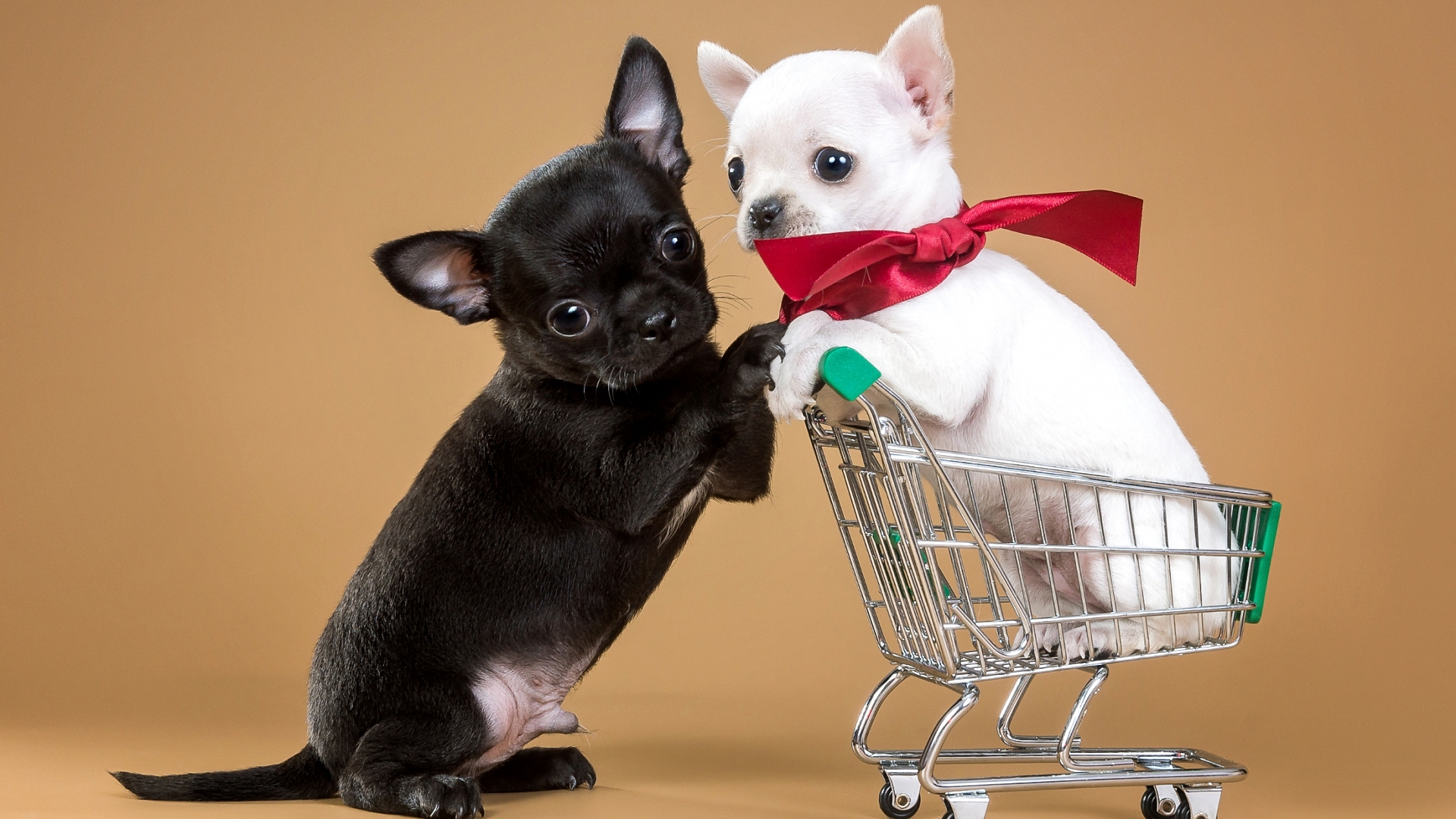 Description: A small dog and a small dog in a shopping cart together.
