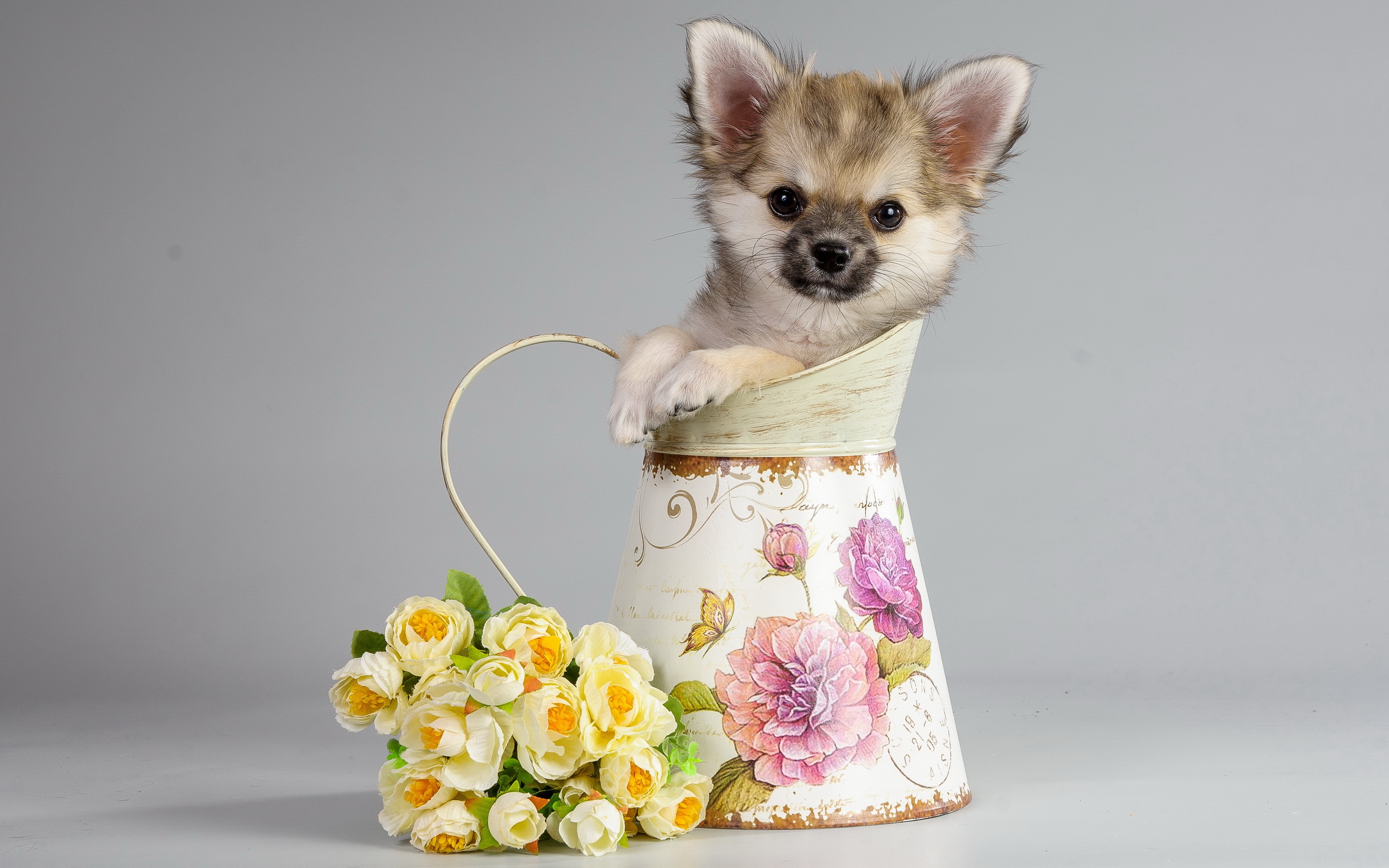 Description: A small dog is sitting in a vase with flowers on it and a small basket of flowers is on the floor.