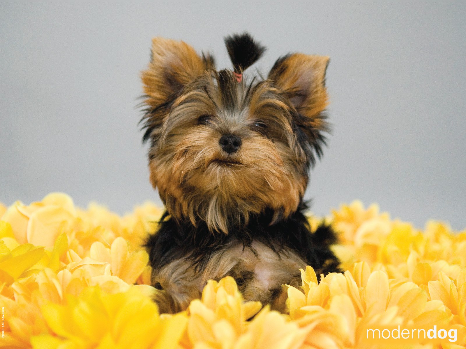 Description: A small dog sitting in a field of yellow flowers with a gray background and a gray sky behind it.