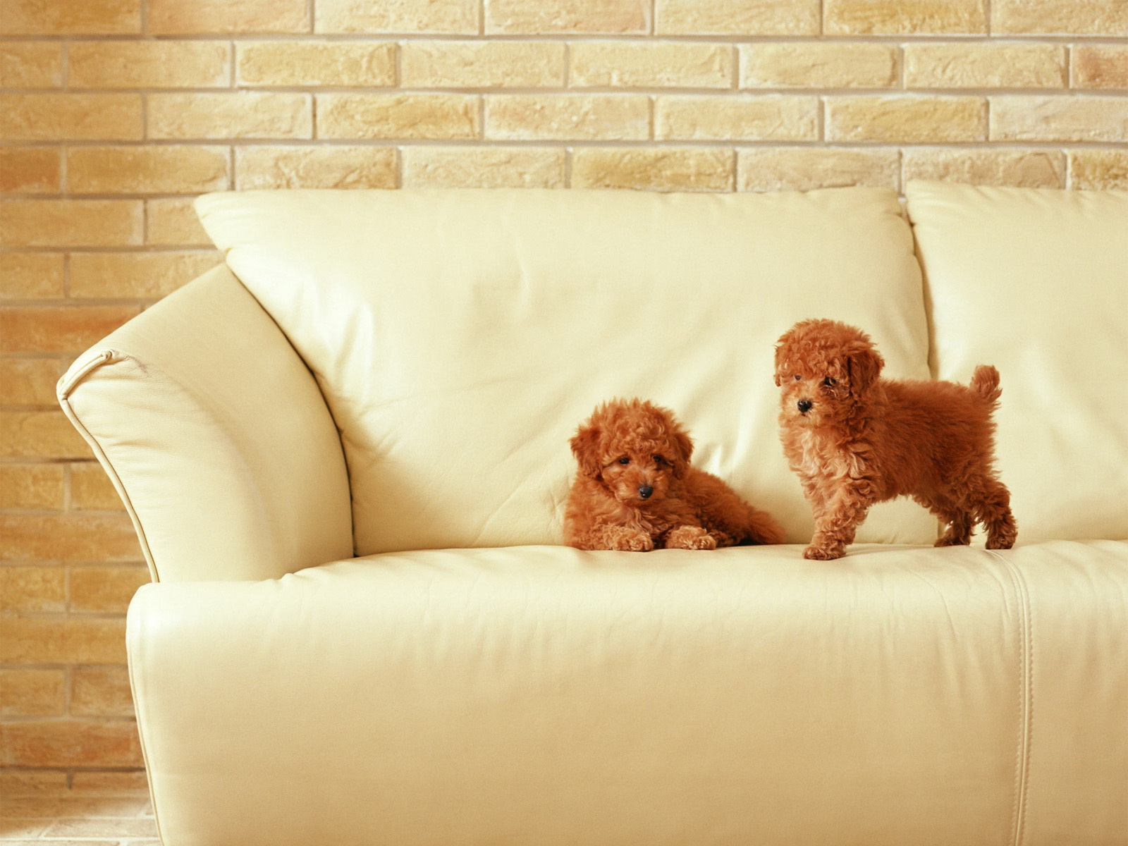 Description: Two small dogs sitting on a couch in front of a brick wall and a brick wall behind them is a brick wall.
