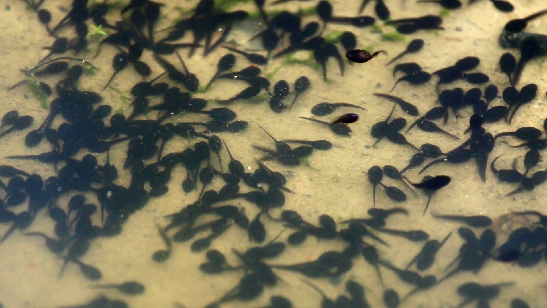 Description: A group of small fish swimming in a pond of water with algae on it's surface and algae on the bottom of the water.