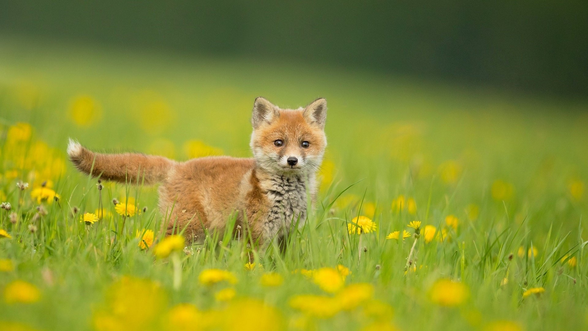 Description: A small fox standing in a field of grass and flowers with yellow flowers around it and a blurry background.