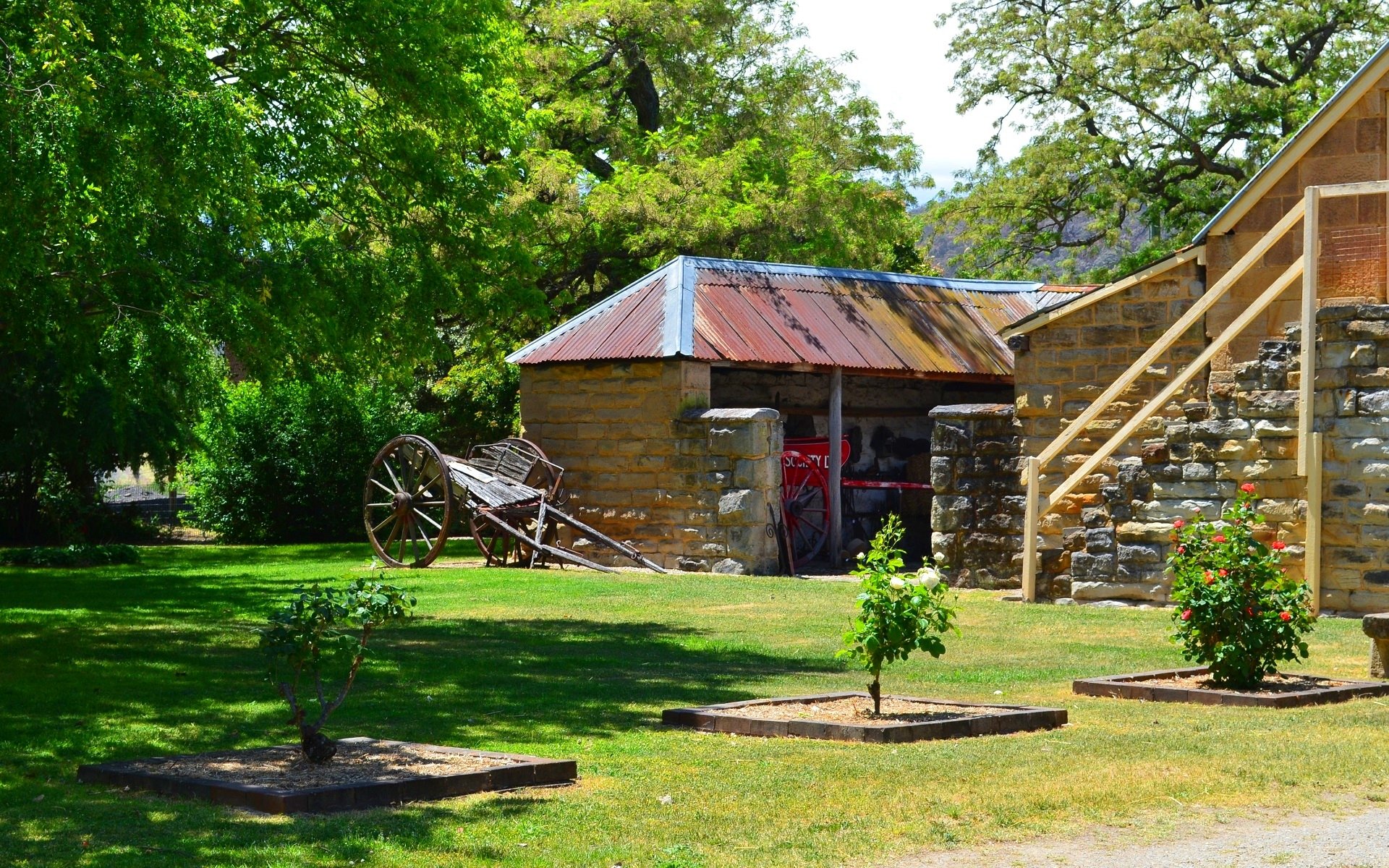 Description: A small garden with a tree and a building in the background with a ladder and a tree in the foreground.