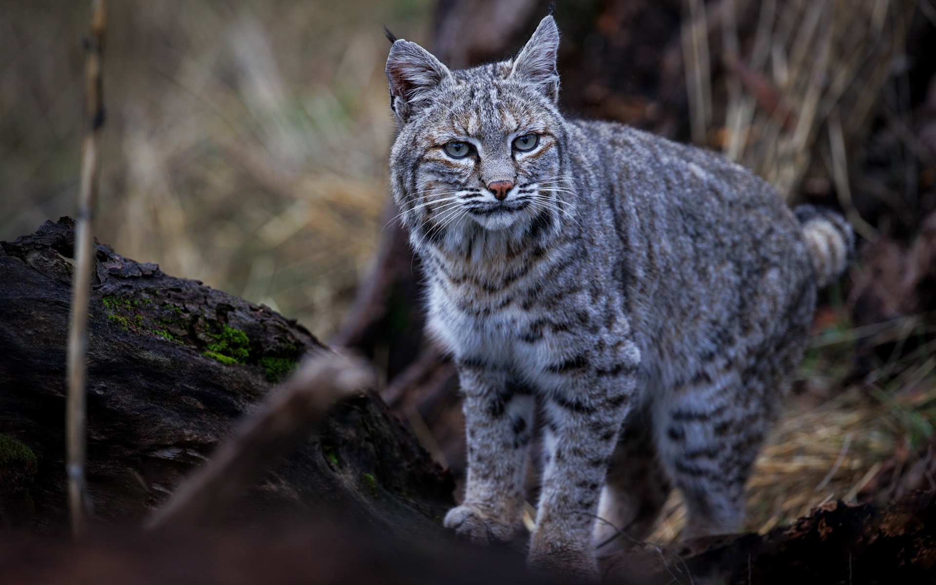 Description: A small gray cat standing on a rock in the woods with a blurry background of grass and trees.
