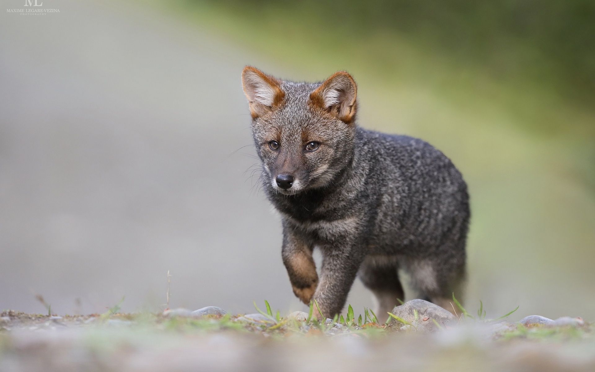 Description: A small gray wolf standing on top of a grass covered field next to a forest filled with trees and rocks.