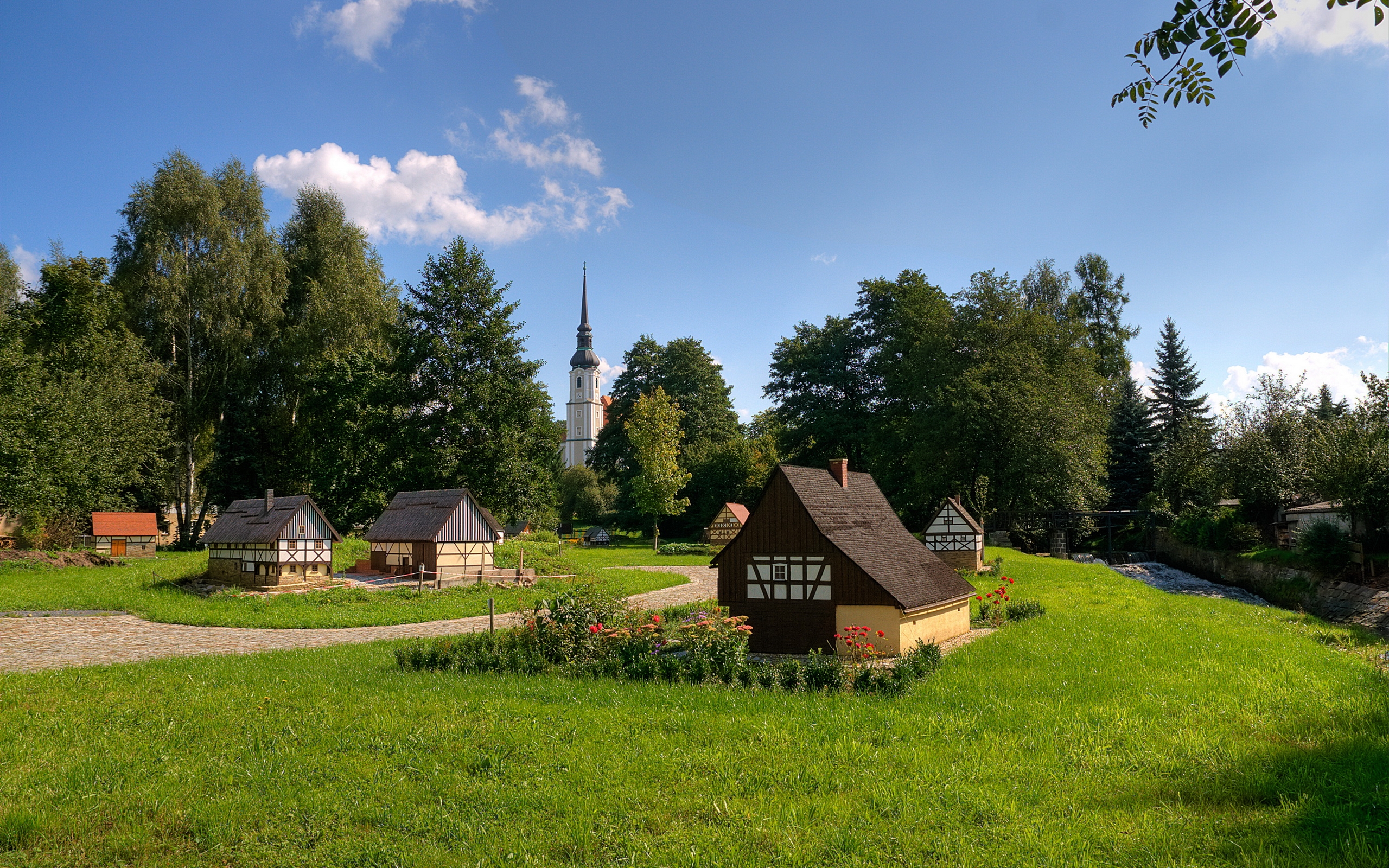 Description: A small house in a grassy area with a path leading to it and a church in the background with a blue sky.