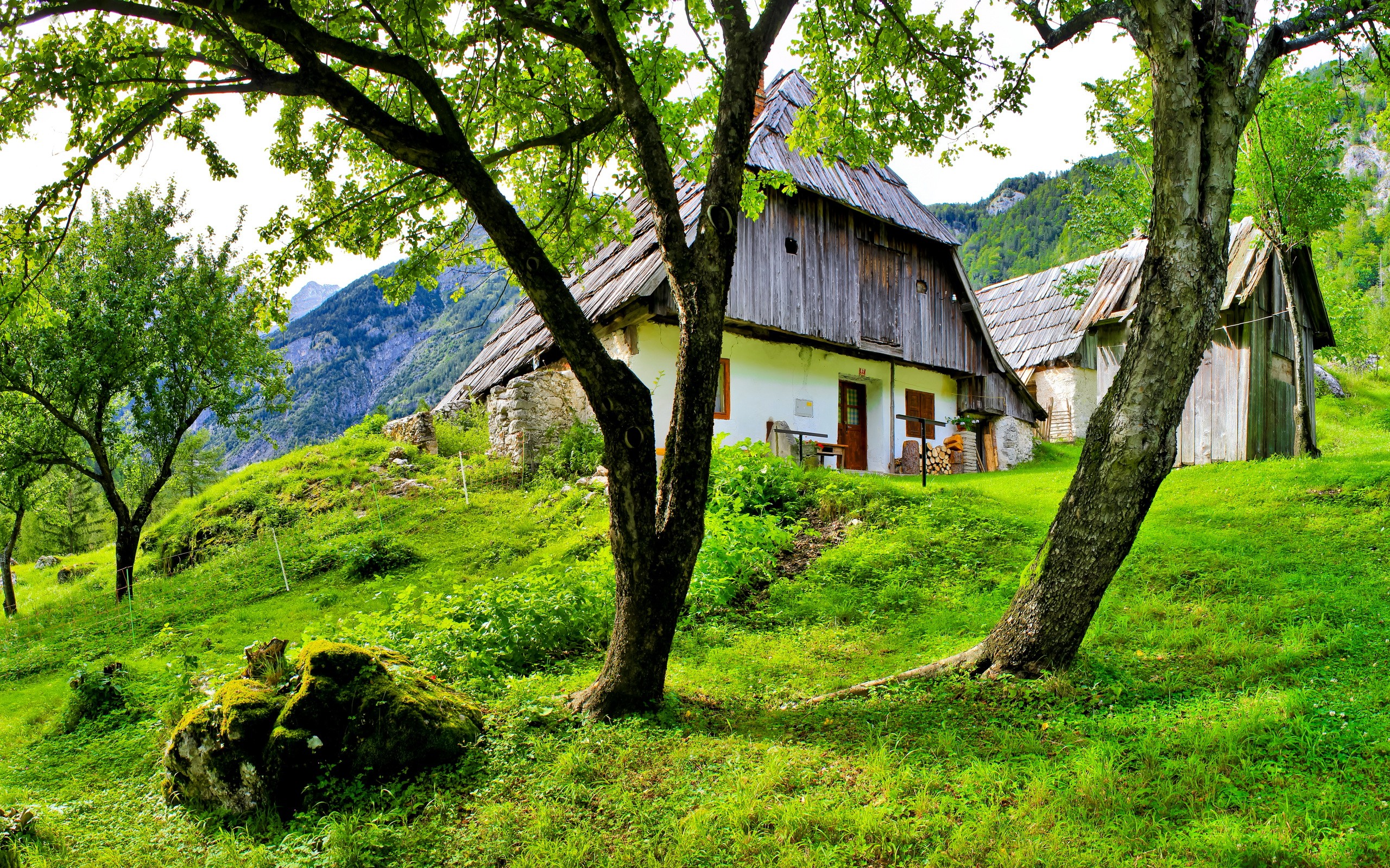 Description: A small house on a hill with a tree in front of it and a rock outcropping.