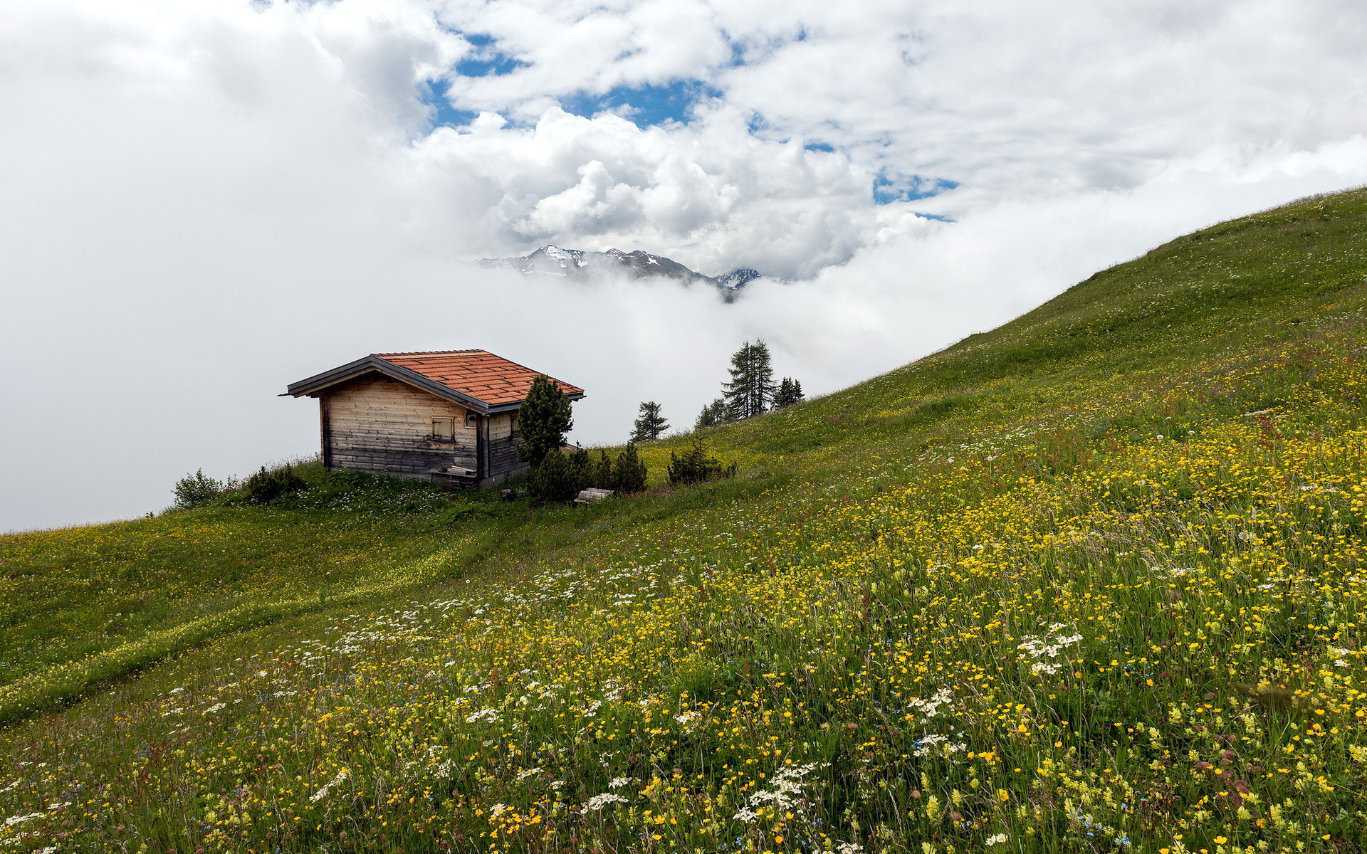 Description: A small house on a hill with a mountain in the background and clouds in the sky above it.
