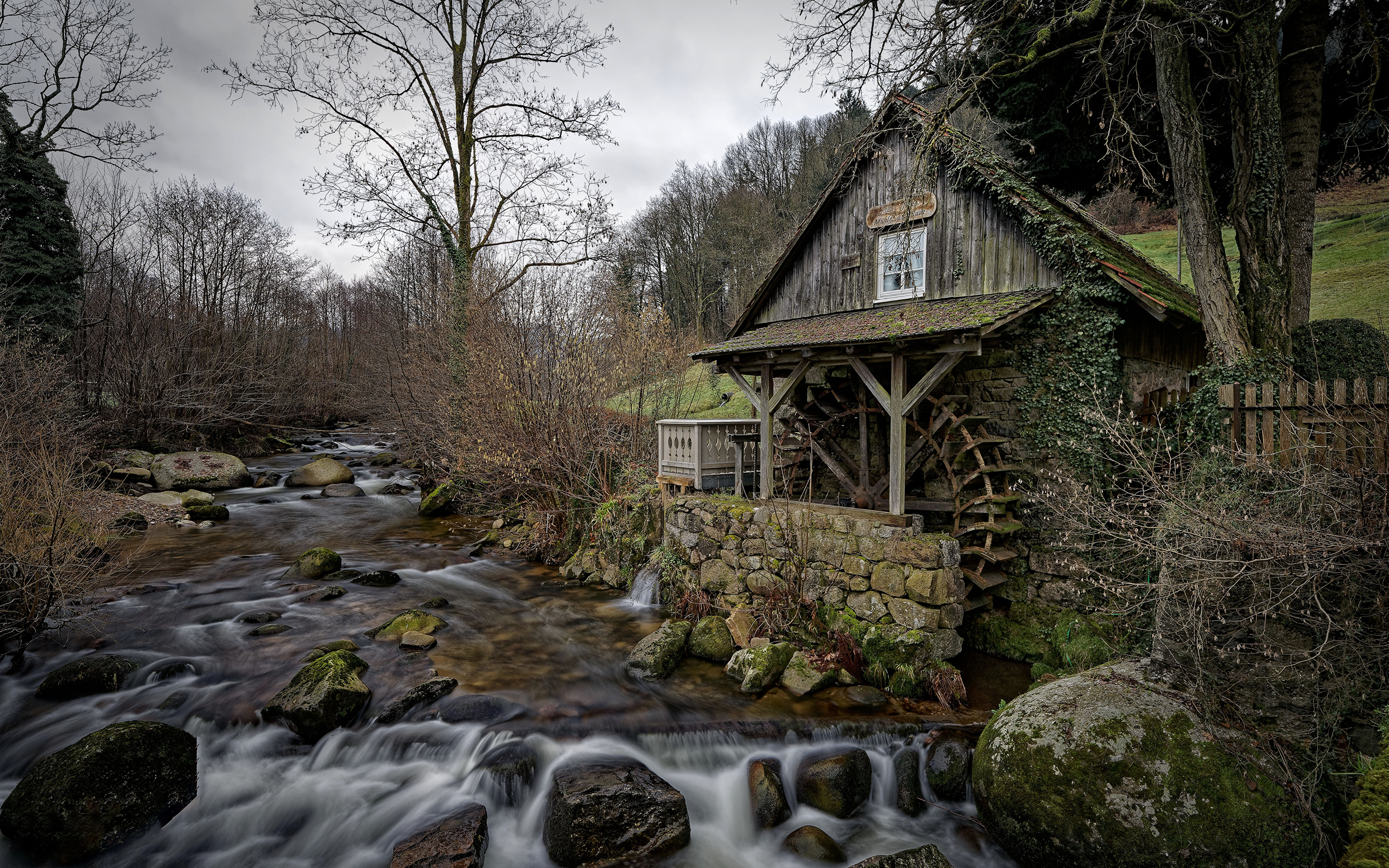 Description: A small house sitting next to a river in the woods with a waterfall running underneath it and a wooden bridge.