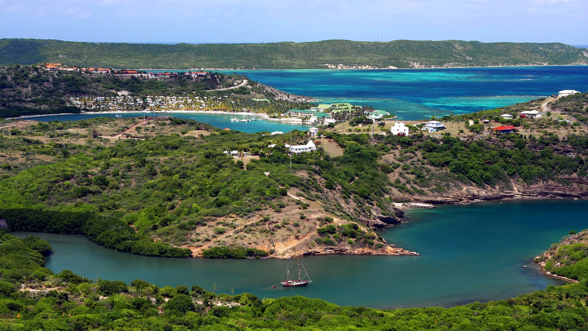 Description: A small island with a boat in the water and a beach in the background with a lot of trees.