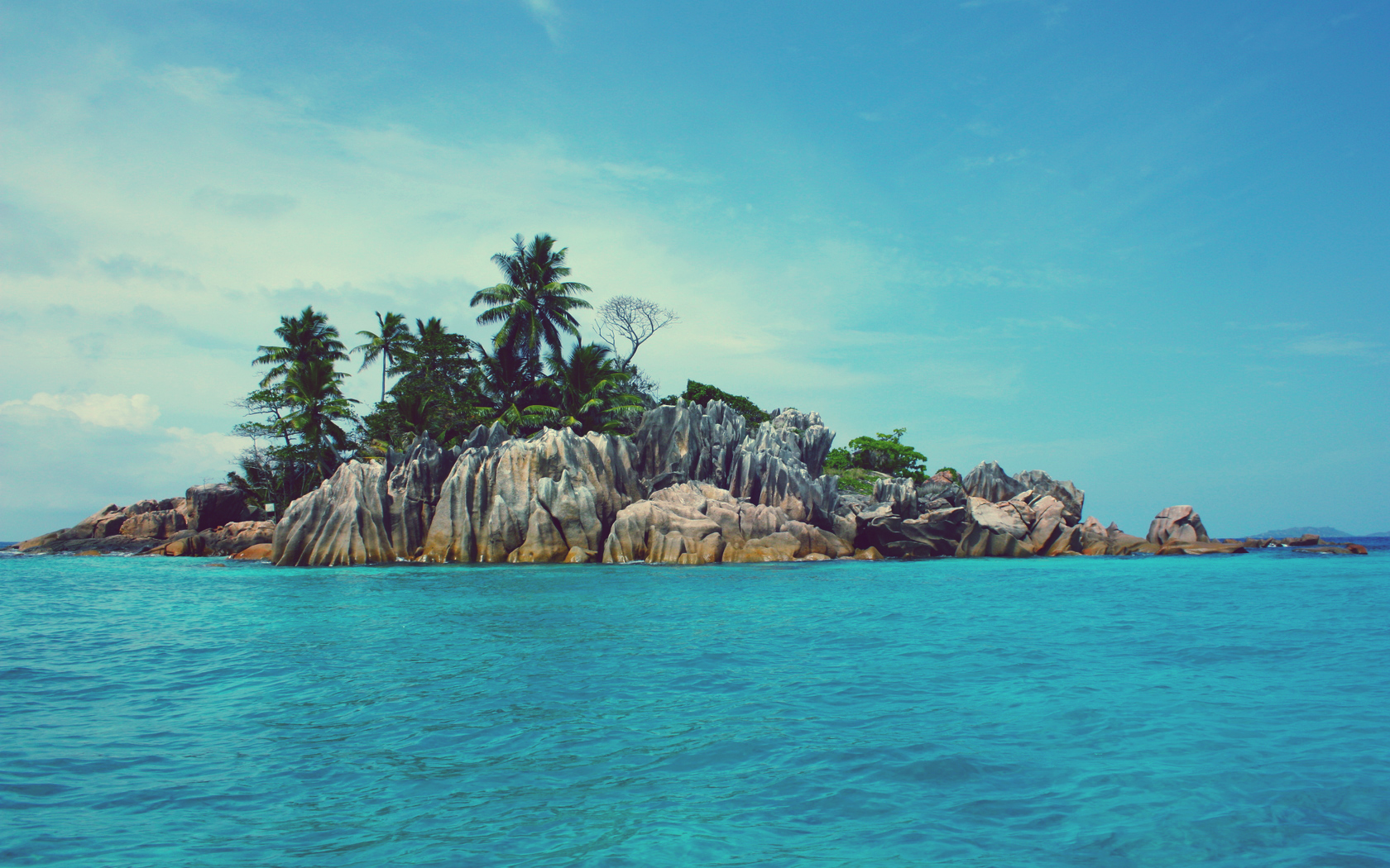 Description: A small island with palm trees on top of it in the ocean with blue water and a boat in the distance.