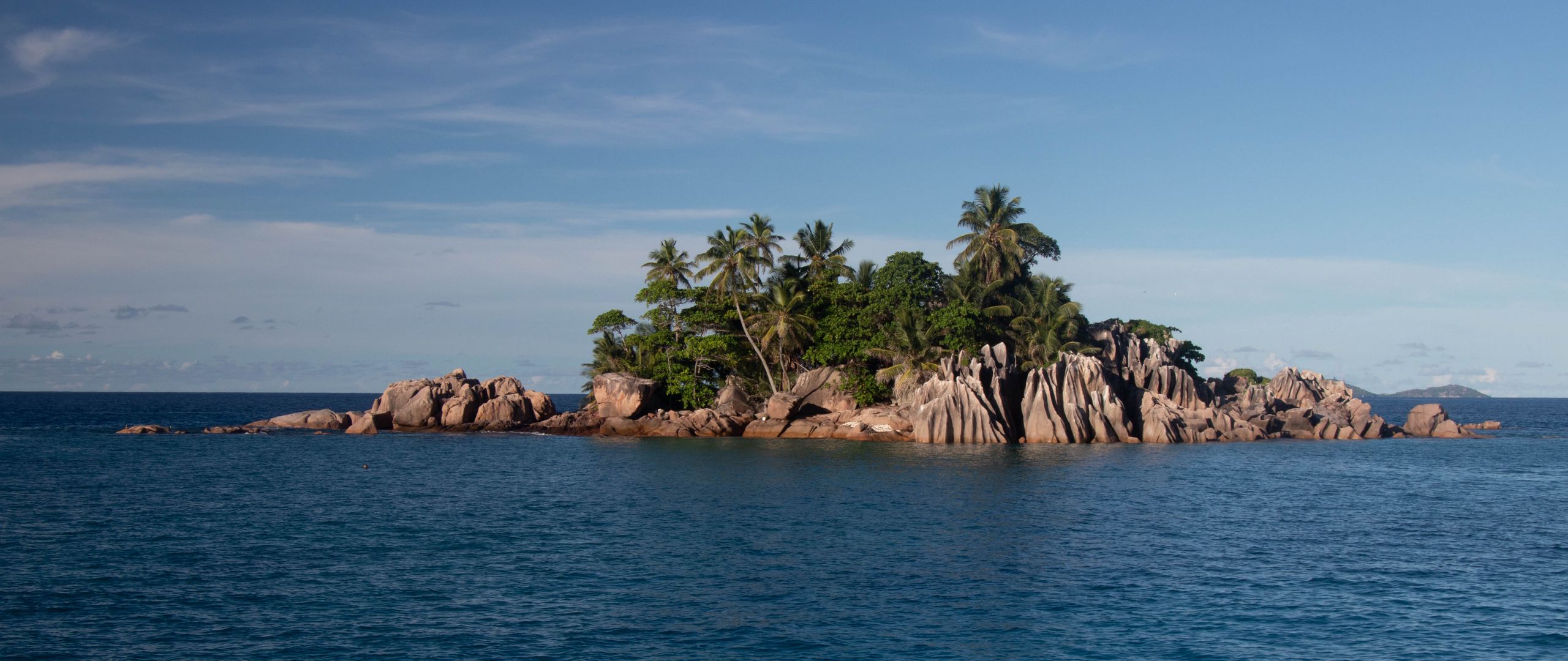 Description: A small island with palm trees on a clear day in the ocean with a blue sky and clouds above.