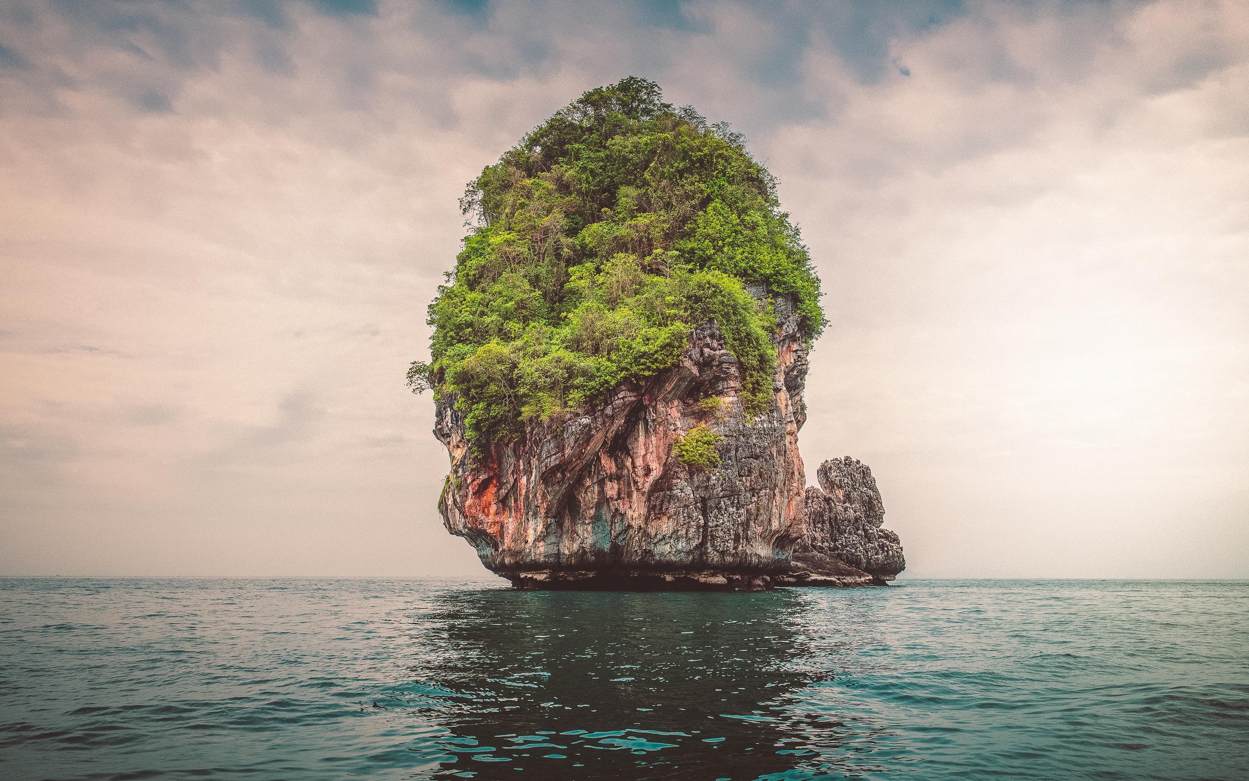Description: A small island in the middle of the ocean with a tree growing on it's head and a boat in the water below.